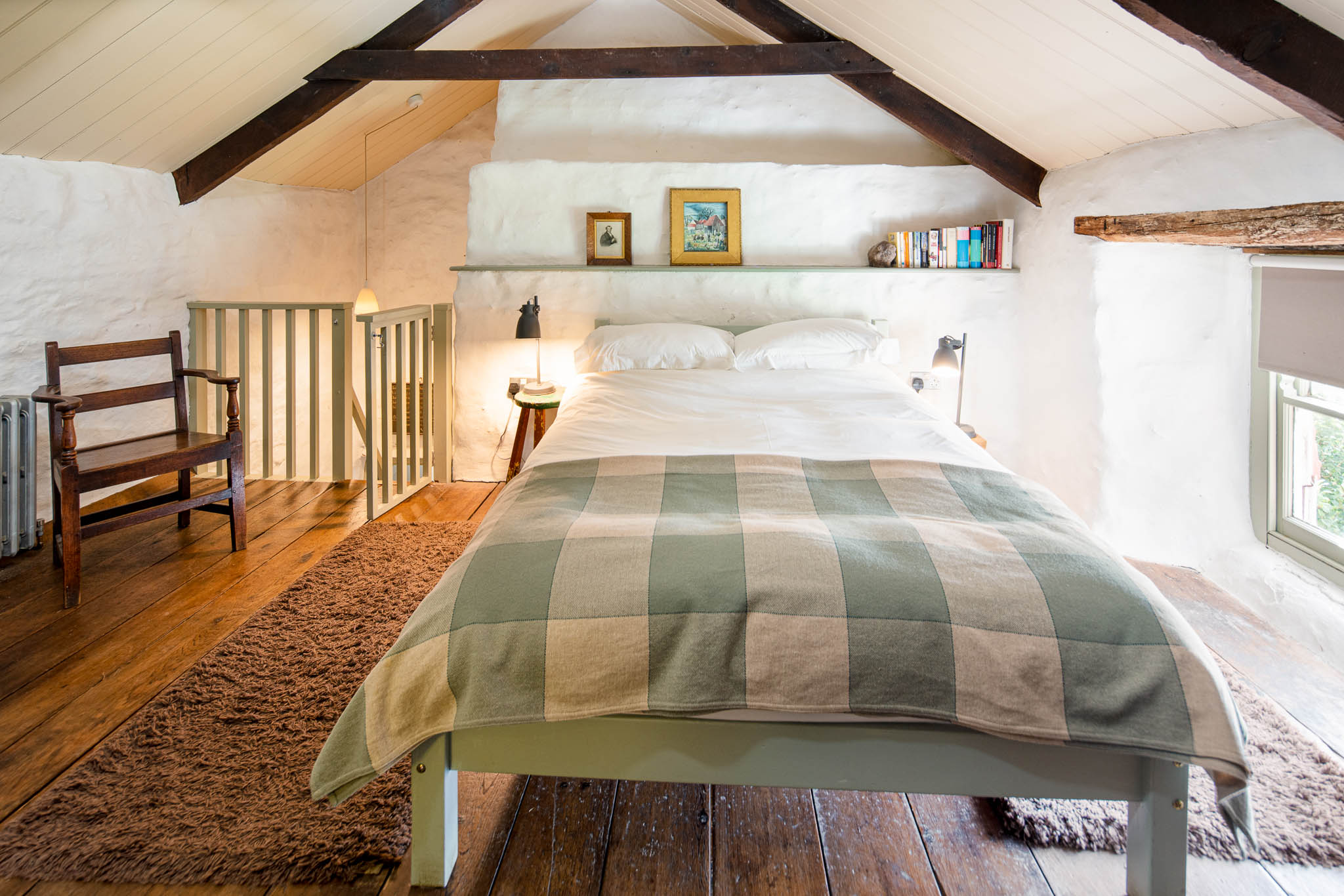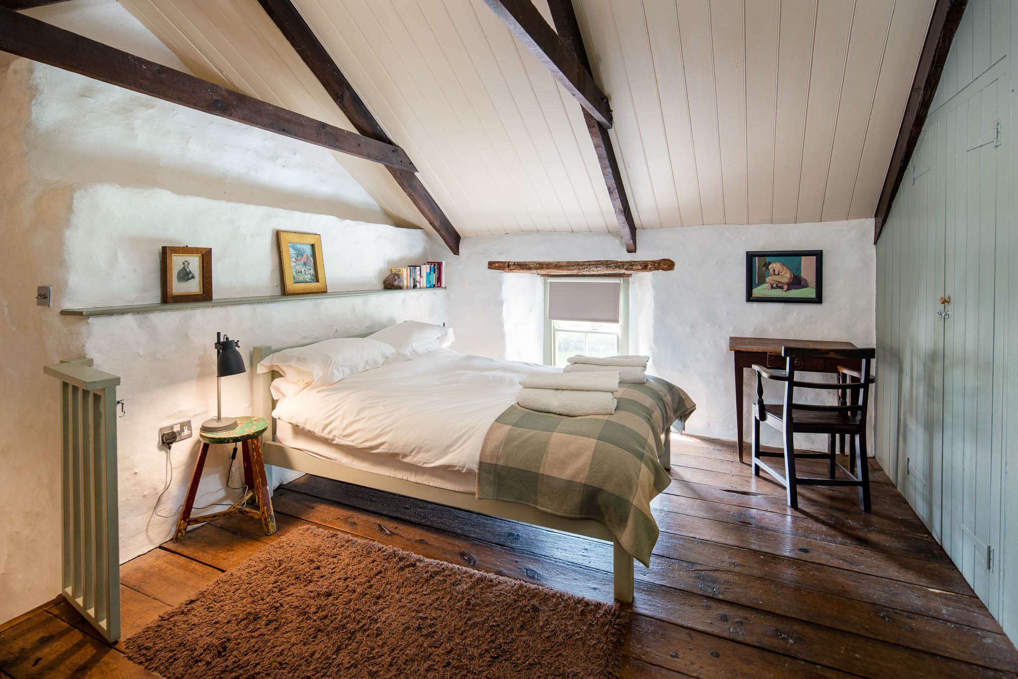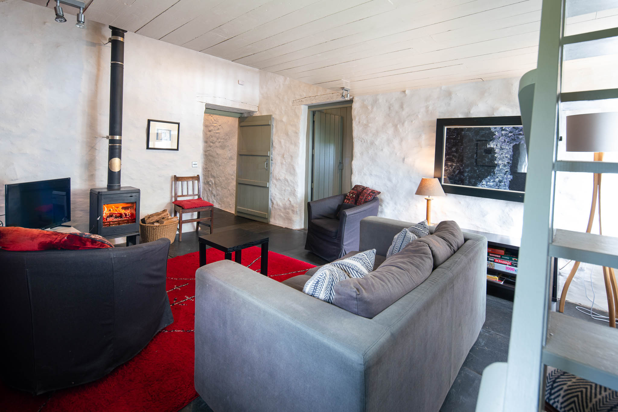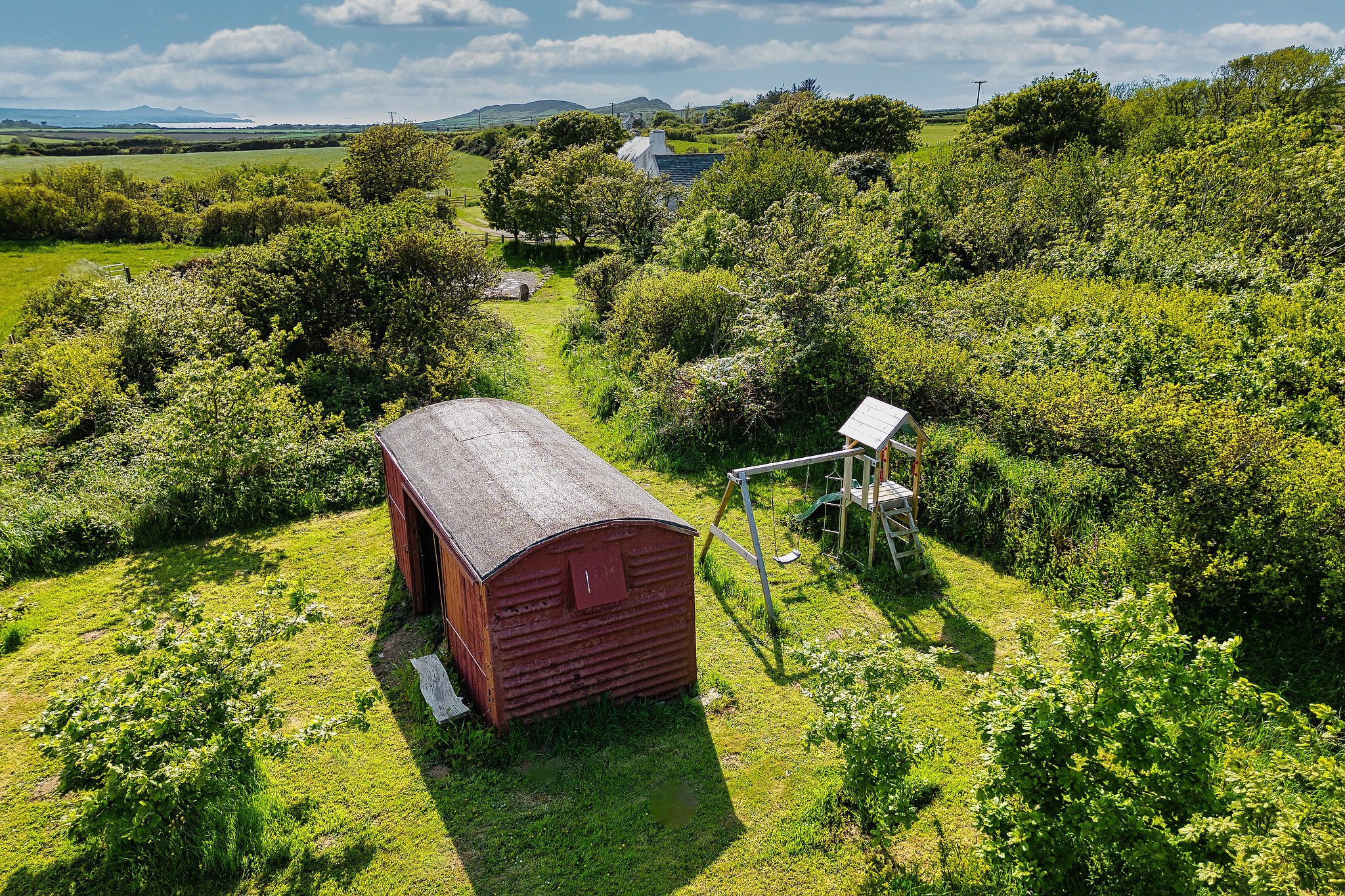 Kitchen - well equipped with usual appliances, e.g. dishwasher, microwave etc. Nespresso machine and a cafetière. Access to rear gardens - one of four doors to the property (two front, two rear), so you are never far from the wonderful outside space and fields. Cegin Fawr - traditional ingle-nook room with dining area - large country table sits 8 easily. Dresser etc. Lounge with contemporary wood burner, and direct access to the front and rear gardens. The first basket of logs is supplied. TV (not smart enabled) & DVD player. Sofa and tub chairs, stairs up to croglofft over. Bathroom and toilet to ground floor (bath, no shower). Small 'Utility' area with washing machine and dryer. Master bedroom (up steep stairs, gated at top), double bed (great mattress) etc with en-suite shower-room off (chrome heated towel rail etc). Large shower cubicle. Croglofft bedroom (up steep stairs, gated at top, low headroom in parts) - best suited to kids, this has two good single beds, and overlooks the main lounge via a balcony. Good quality mattresses. Centrally heated throughout (Carbon Neutral eco-heating system), with underfloor heating Note that there are steep open-tread stairs up to both bedrooms (gated at top), so this cottage won't be suitable for the infirm. This house is semi-detached with Trehilyn Uchaf, and if they are taken together an internal door between the kitchens can be opened to use them as one house. Outside: