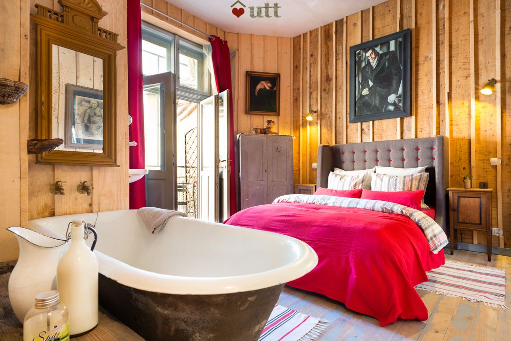 Bedroom - with large rear balcony off. Newly lined with antique wood (insulation behind), an antique bath, a 1930s handbasin, and original art (as throughout the flat).