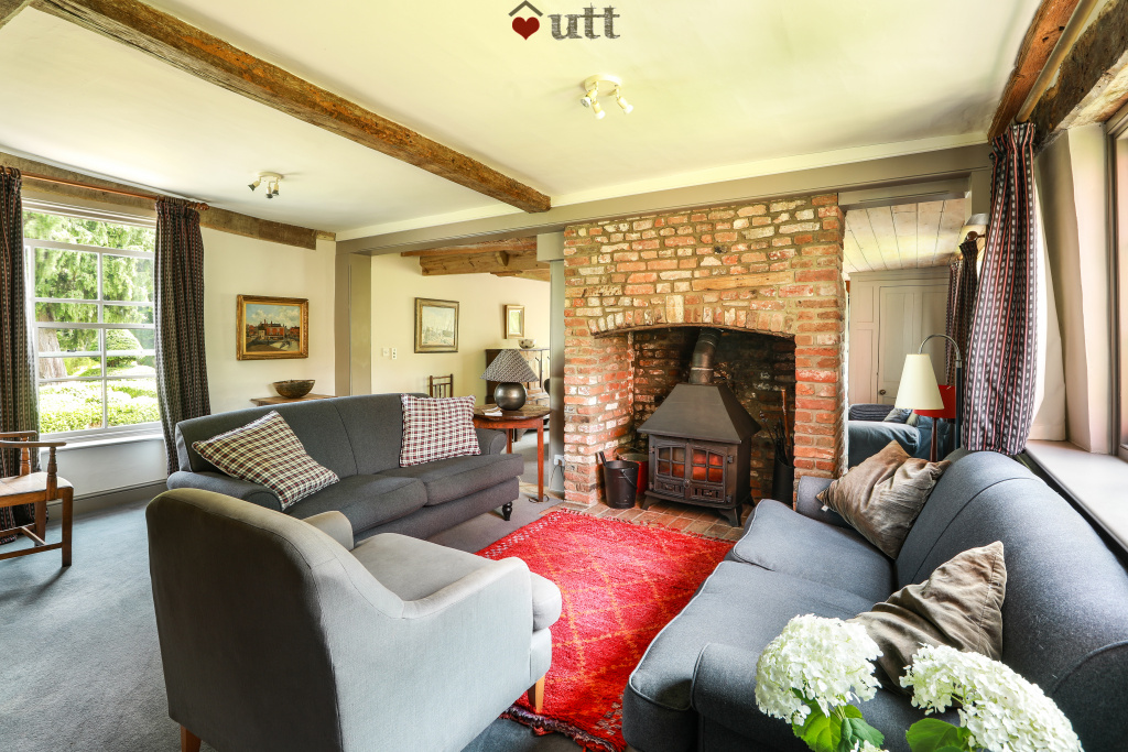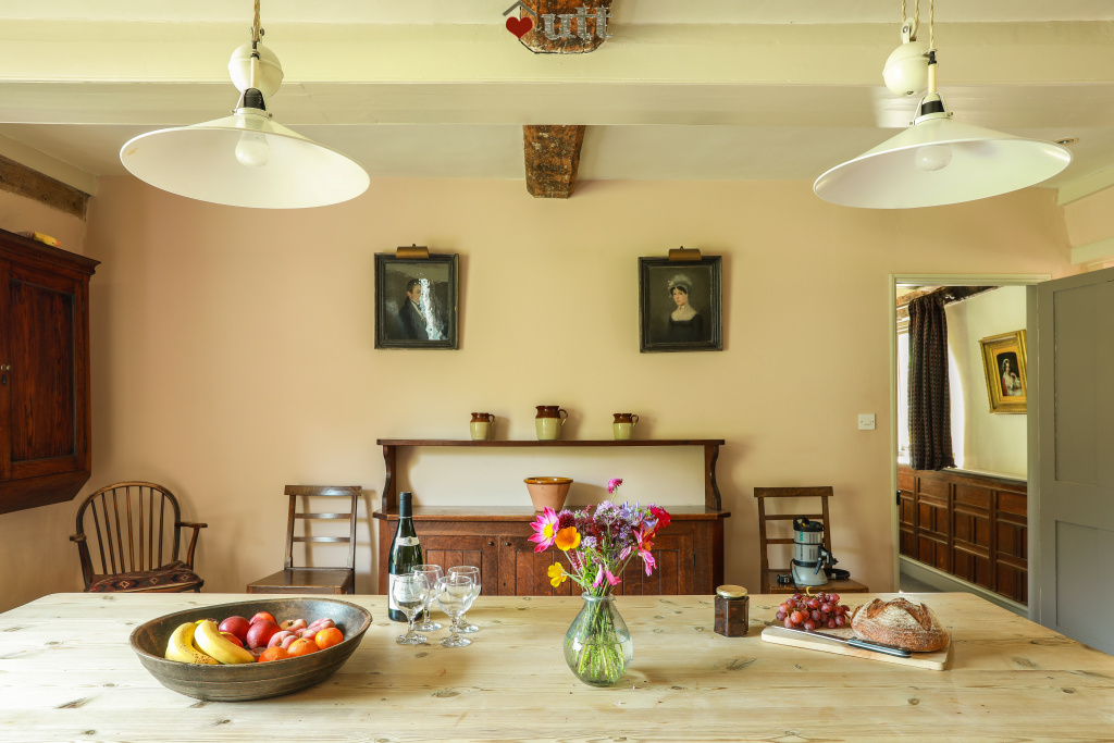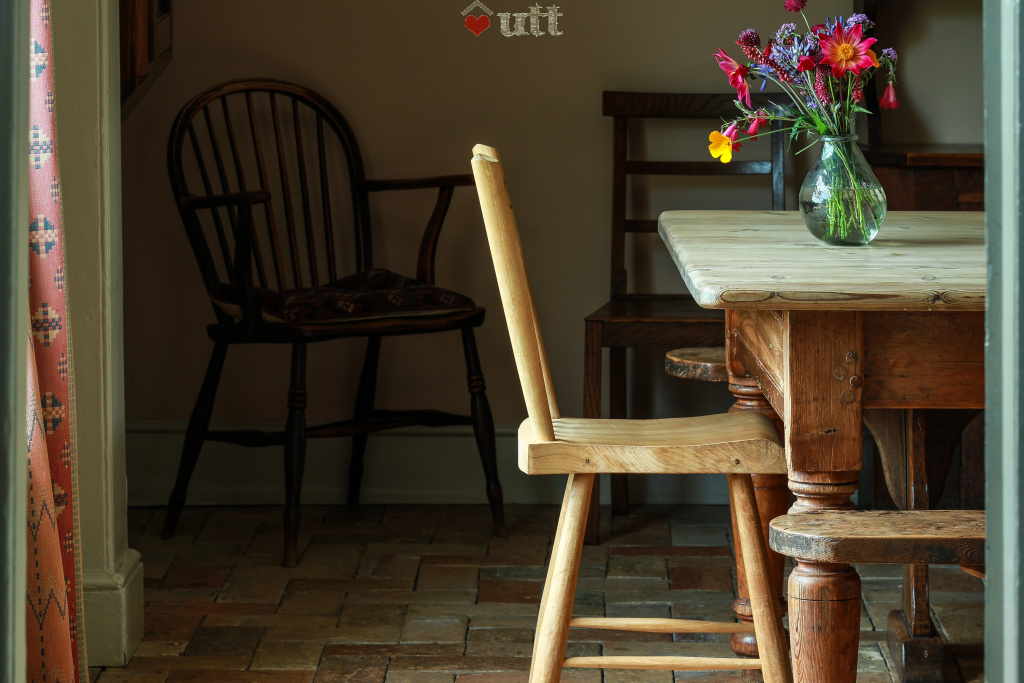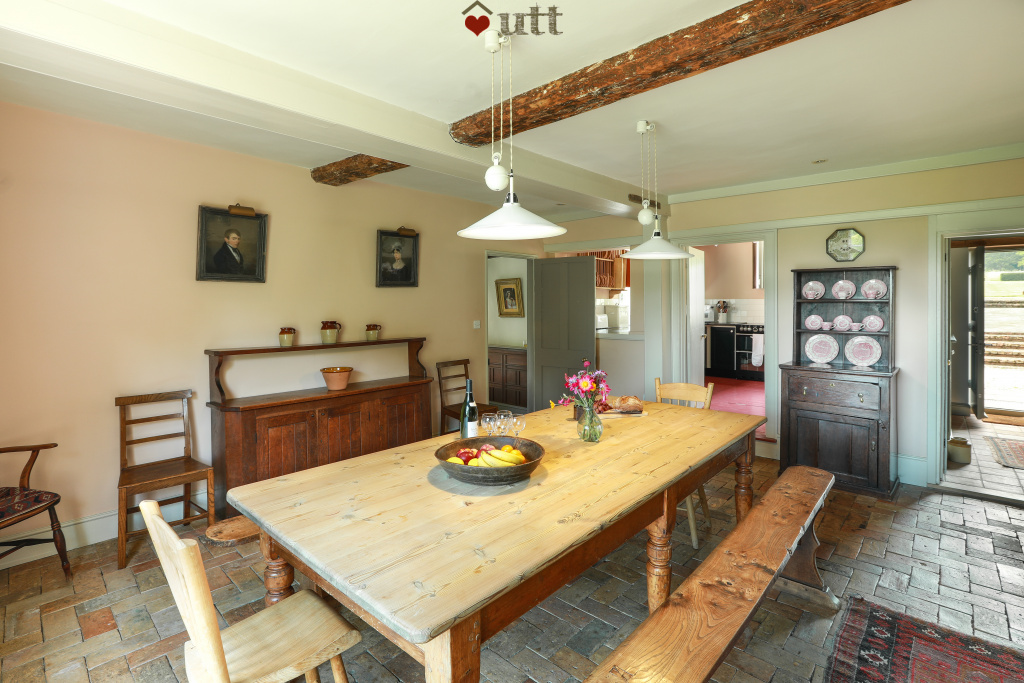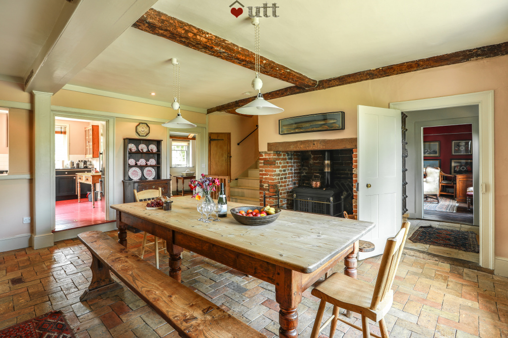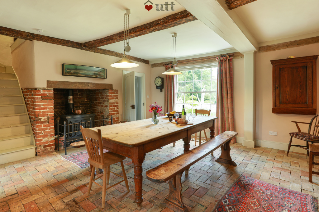 - Dining room – Suffolk brick floor, large farmhouse table, woodburner