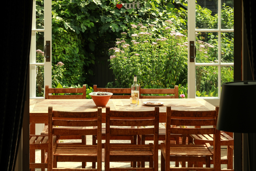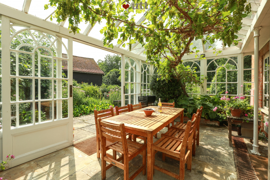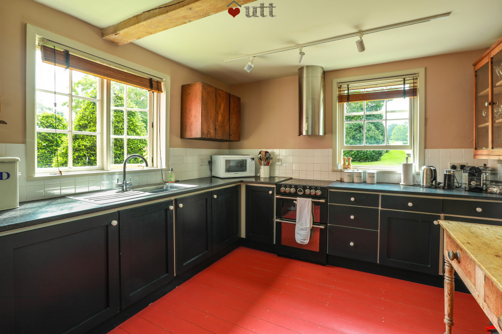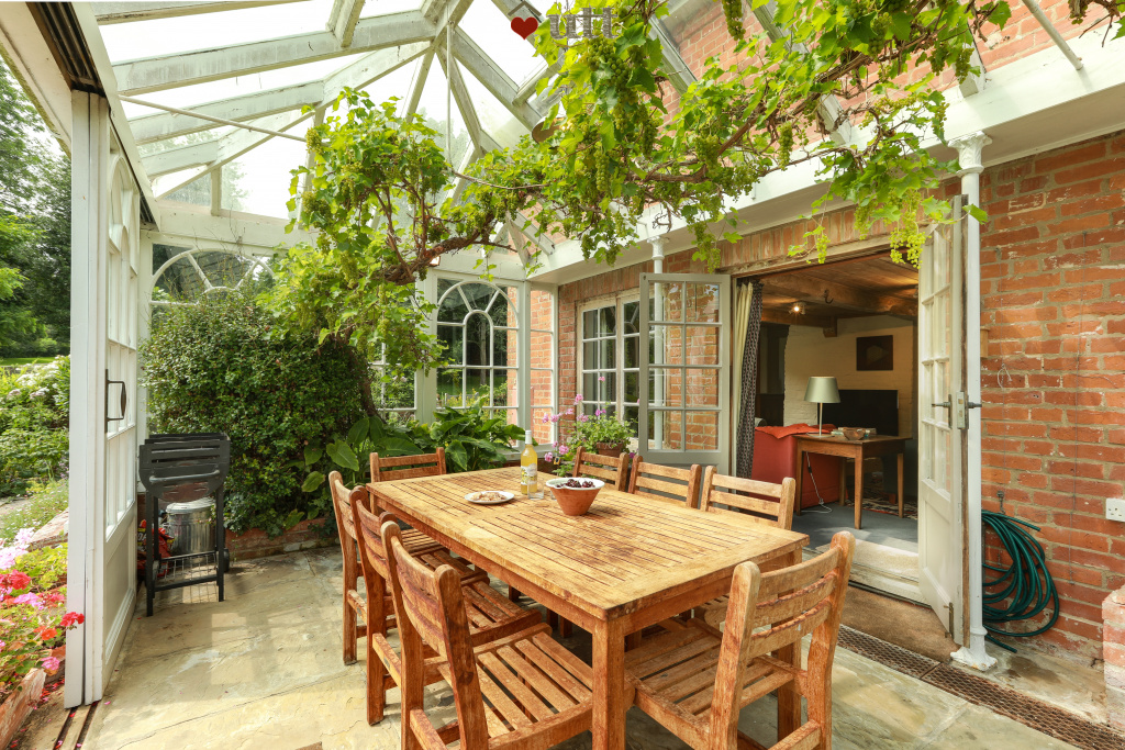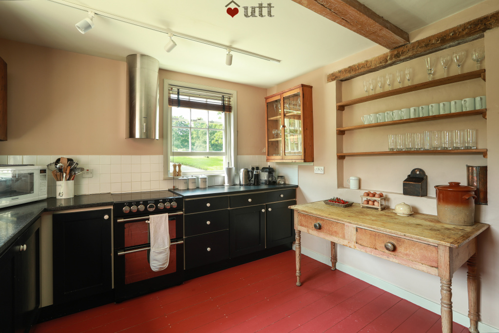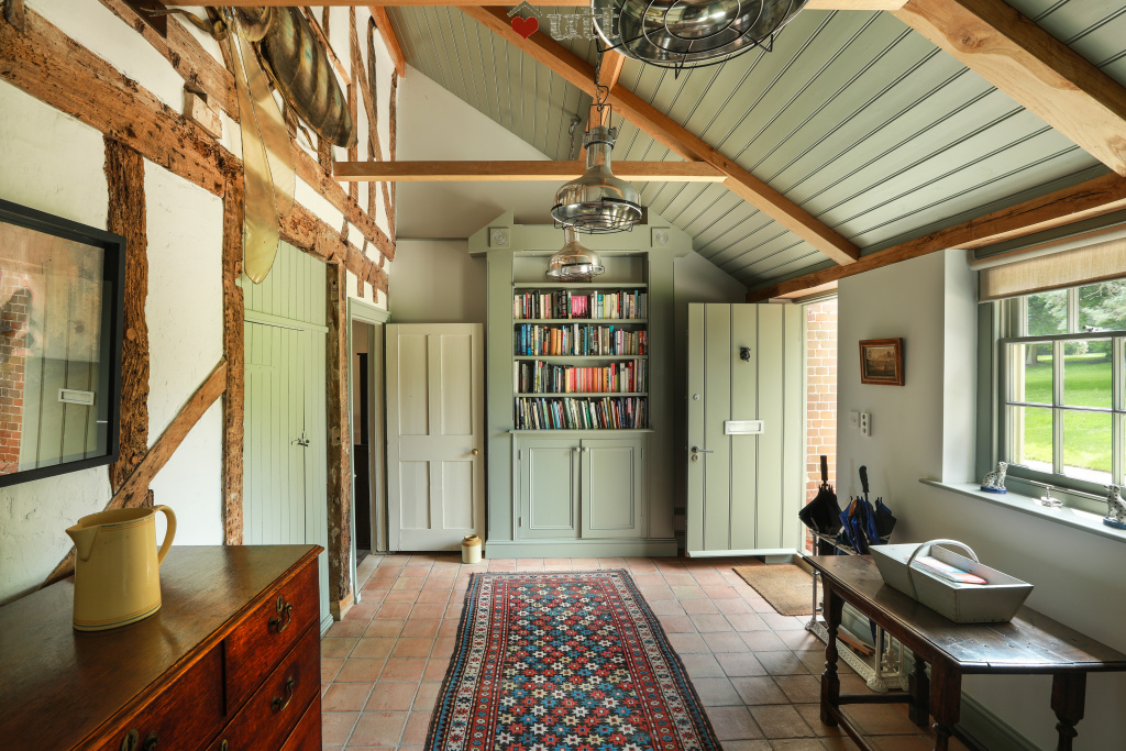 - Dining room – Suffolk brick floor, large farmhouse table, woodburner