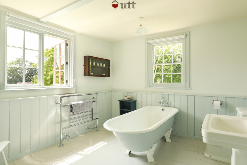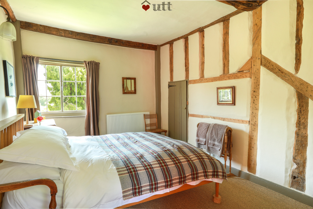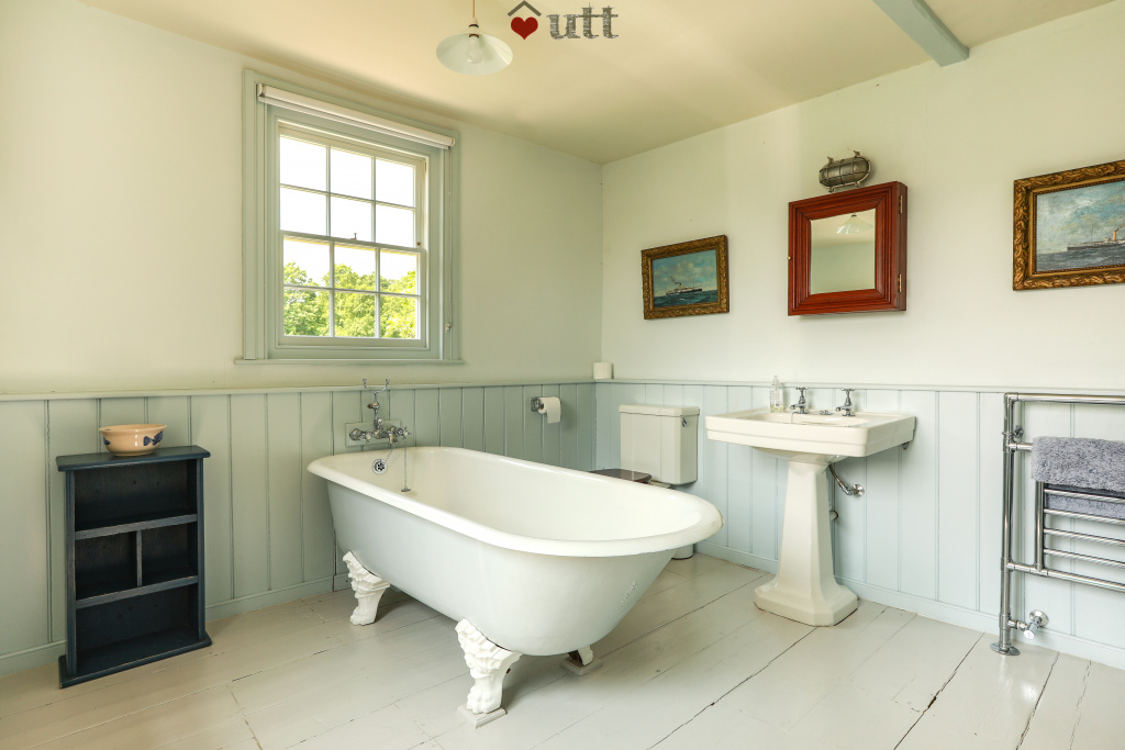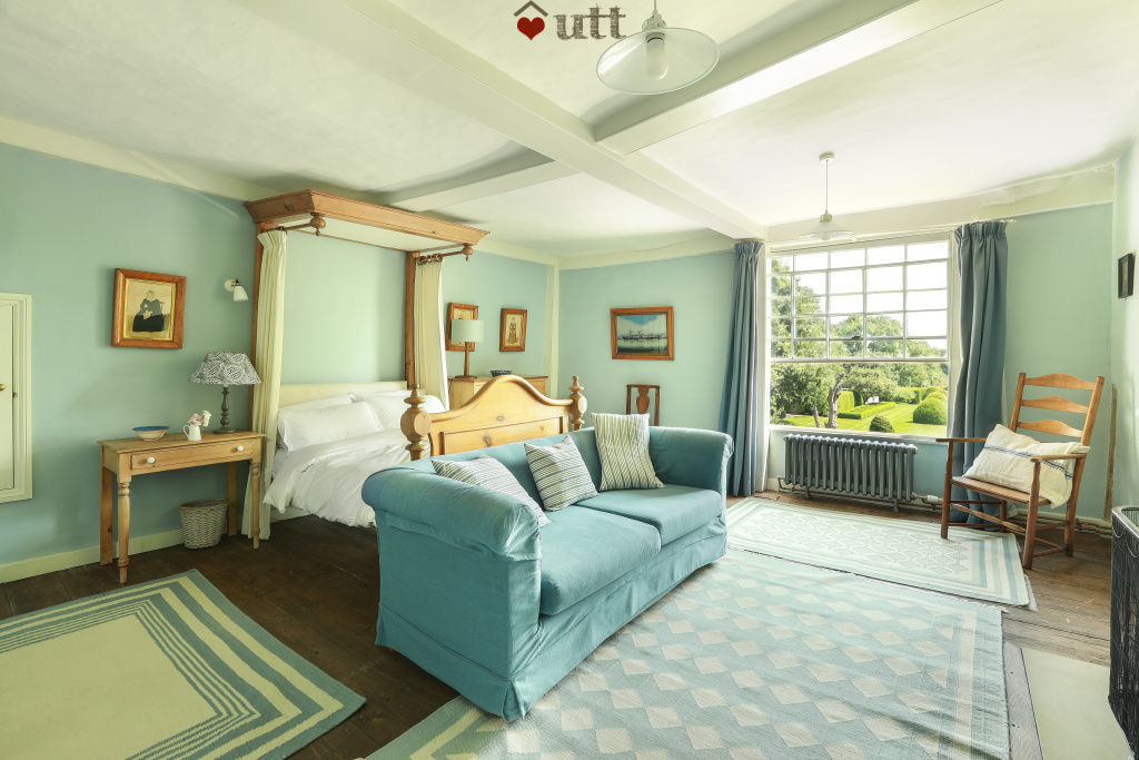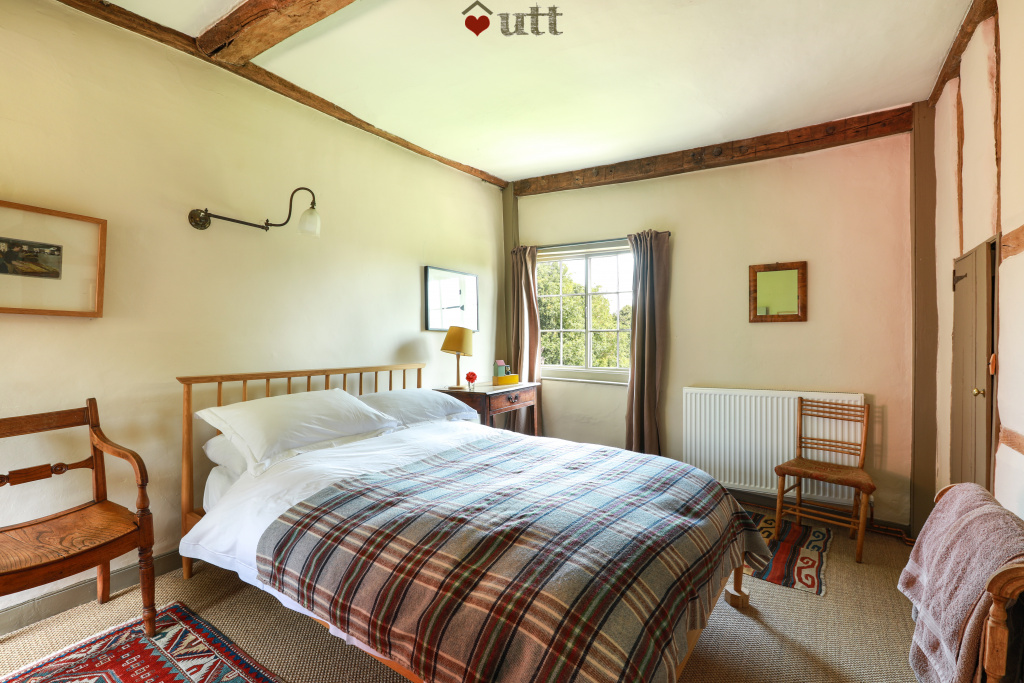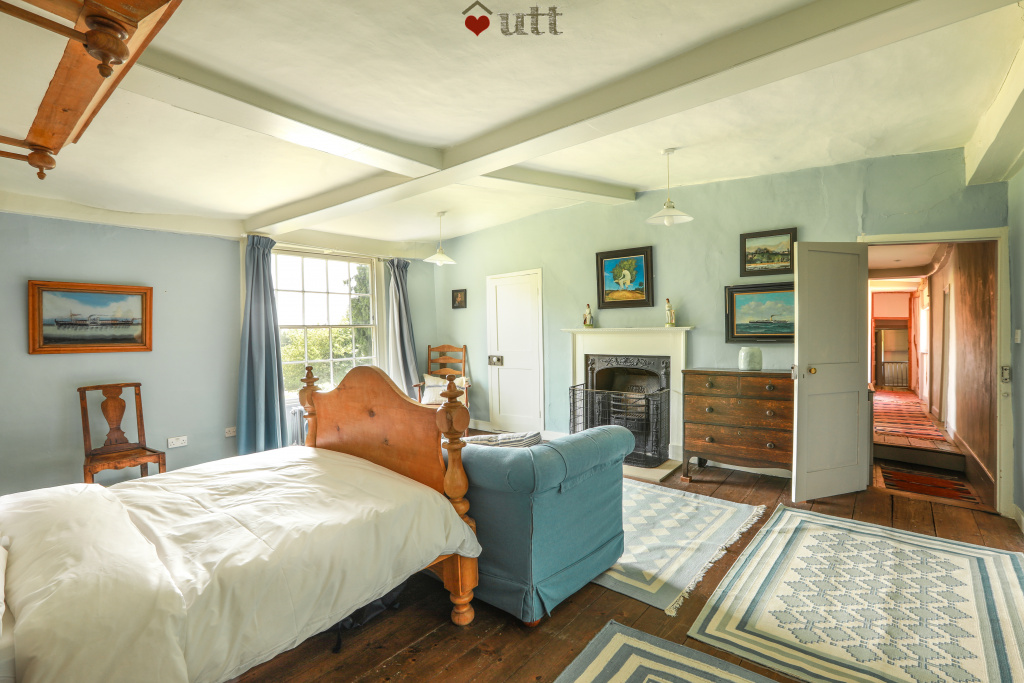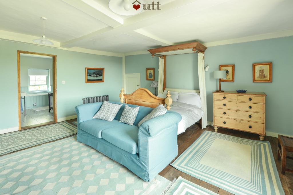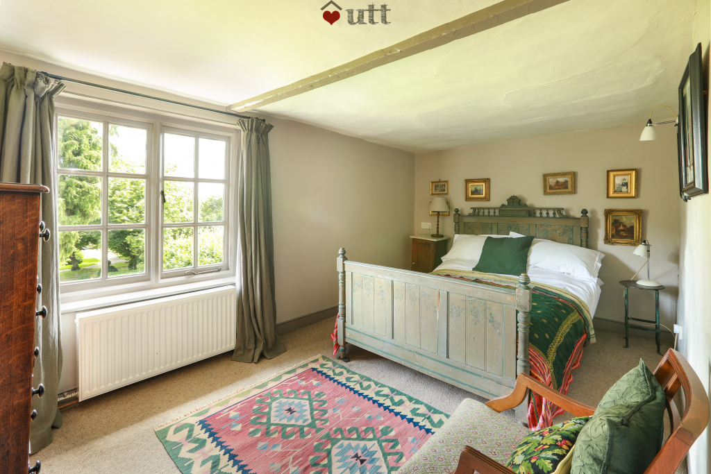 - Master bedroom – double half-tester bed, en-suite bathroom with bath and shower