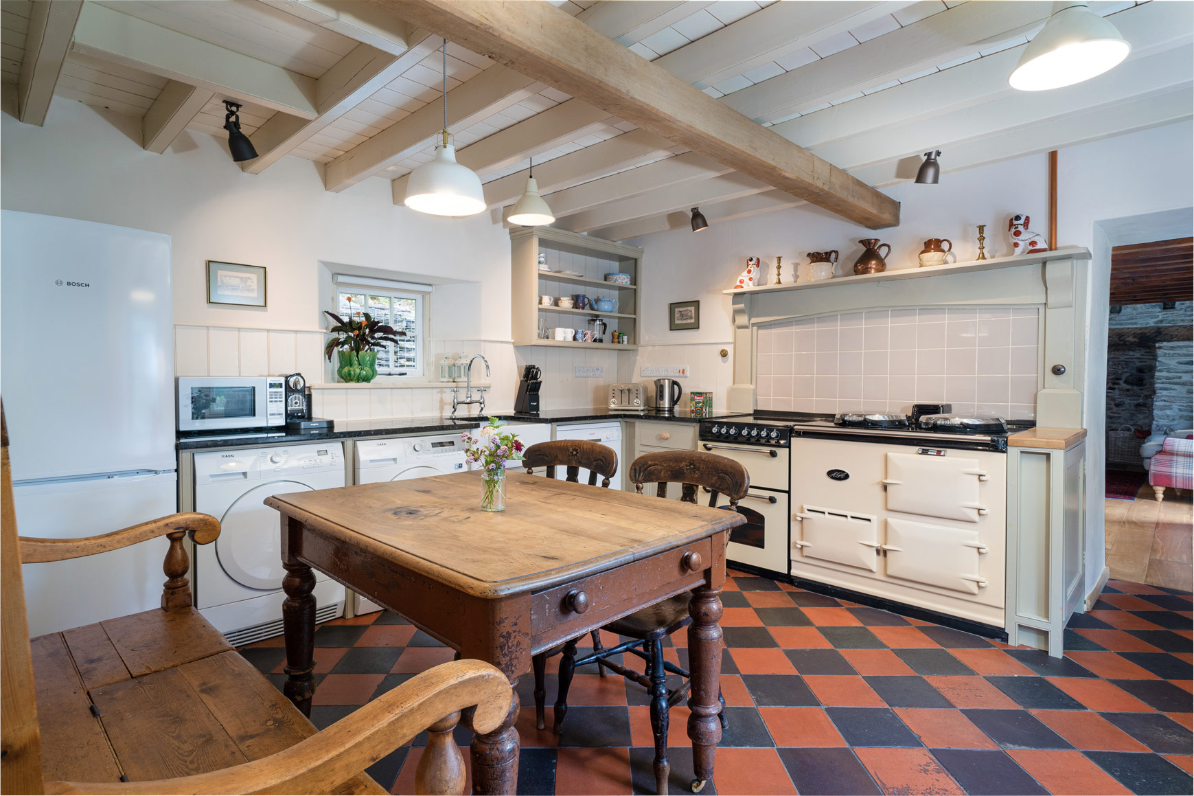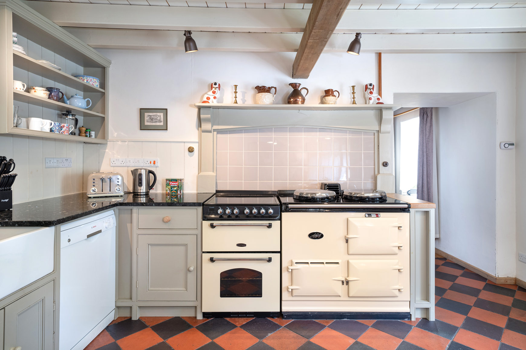 - Well equipped spacious L-shaped Kitchen/Diner with oil fired Aga and separate electric Rangemaster cooker and oven/grill. Reclaimed quarry tiled floor. Granite worktops, belfast sink and bespoke fitted kitchen units with separate dresser. Traditional pine settle and table with two chairs. Bosch/AEG fridge/freezer, washing machine, dryer, dishwasher, microwave and Nespresso coffee maker with milk frother. An iron/ironing board and hairdryer are also provided.