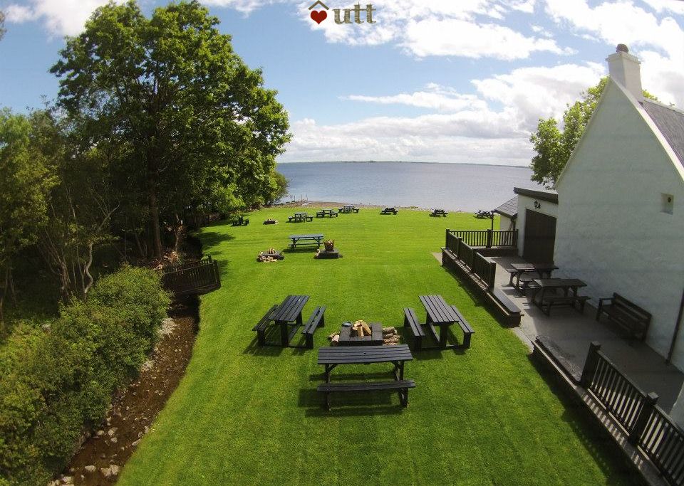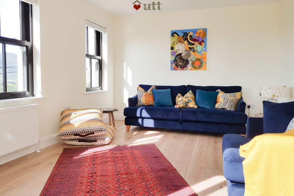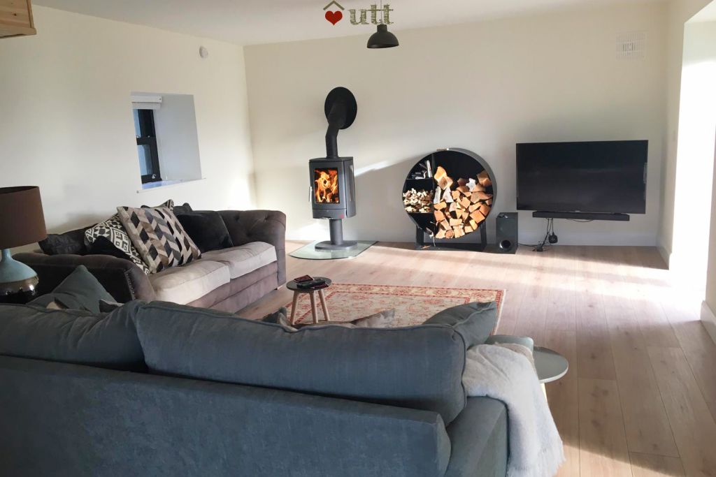Living room: 55in tv, wood-burning stove, large comfortable sofas. French windows lead onto the large patio. Additional smaller, comfortable lounge with outstanding views over the lough and large glass sliding doors to the patio.