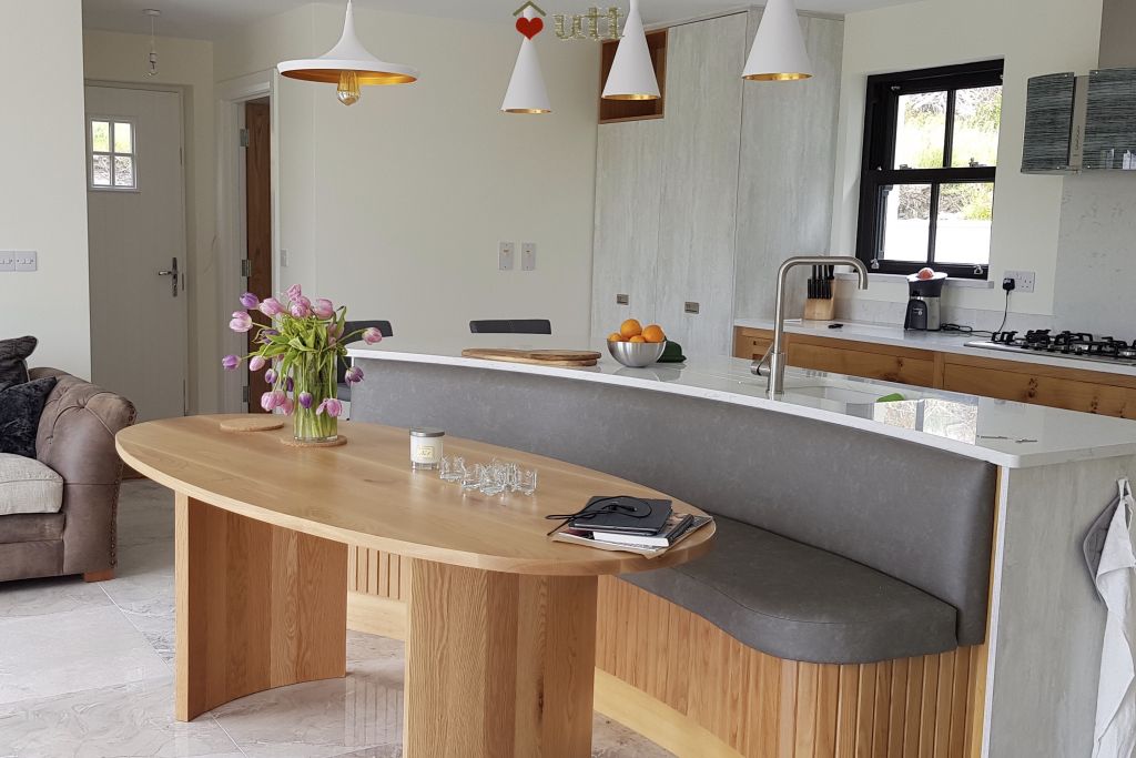 The dining area has built-in seating around the handcrafted oak table with space for 6-8 guests. Woodburning stove.