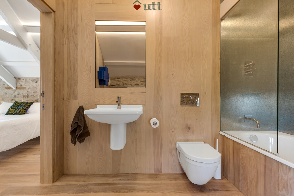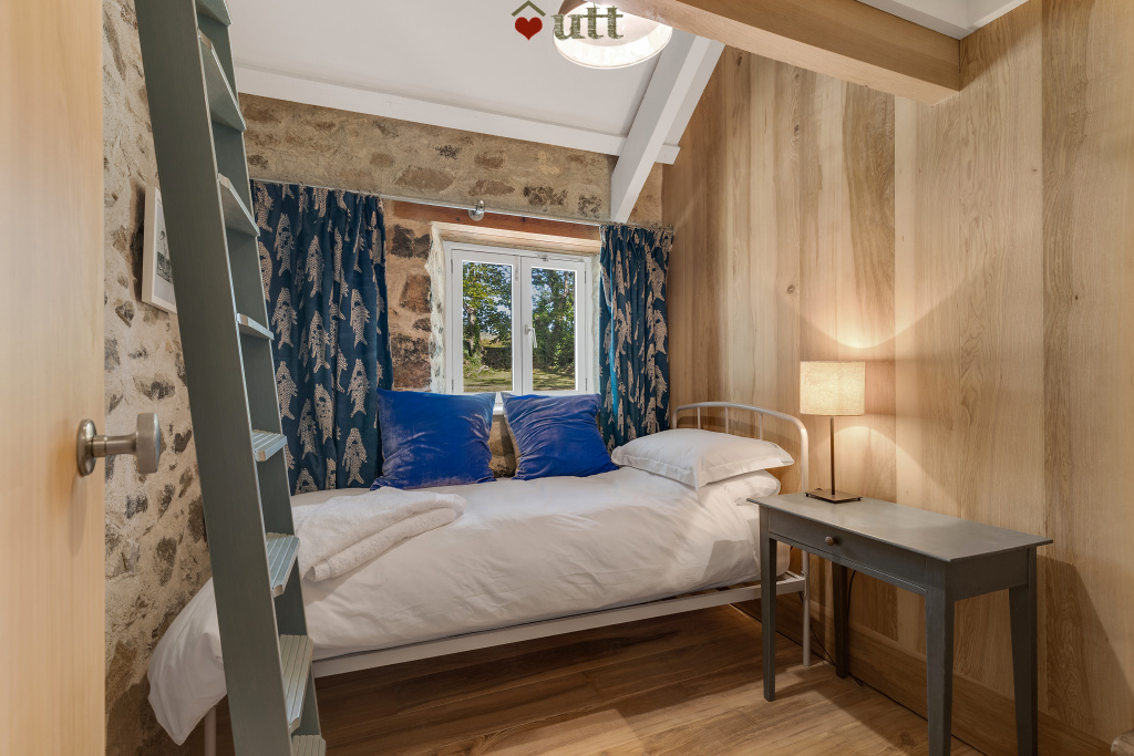 - Bunk bedroom: small room, with single bed and another accessed via a steep ladder in loft space.