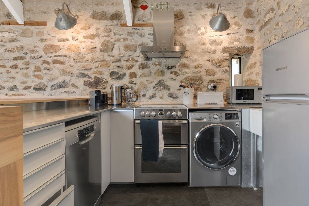 - Kitchen: washing machine, coffee-pod machine, microwave, dishwasher, fridge-freezer