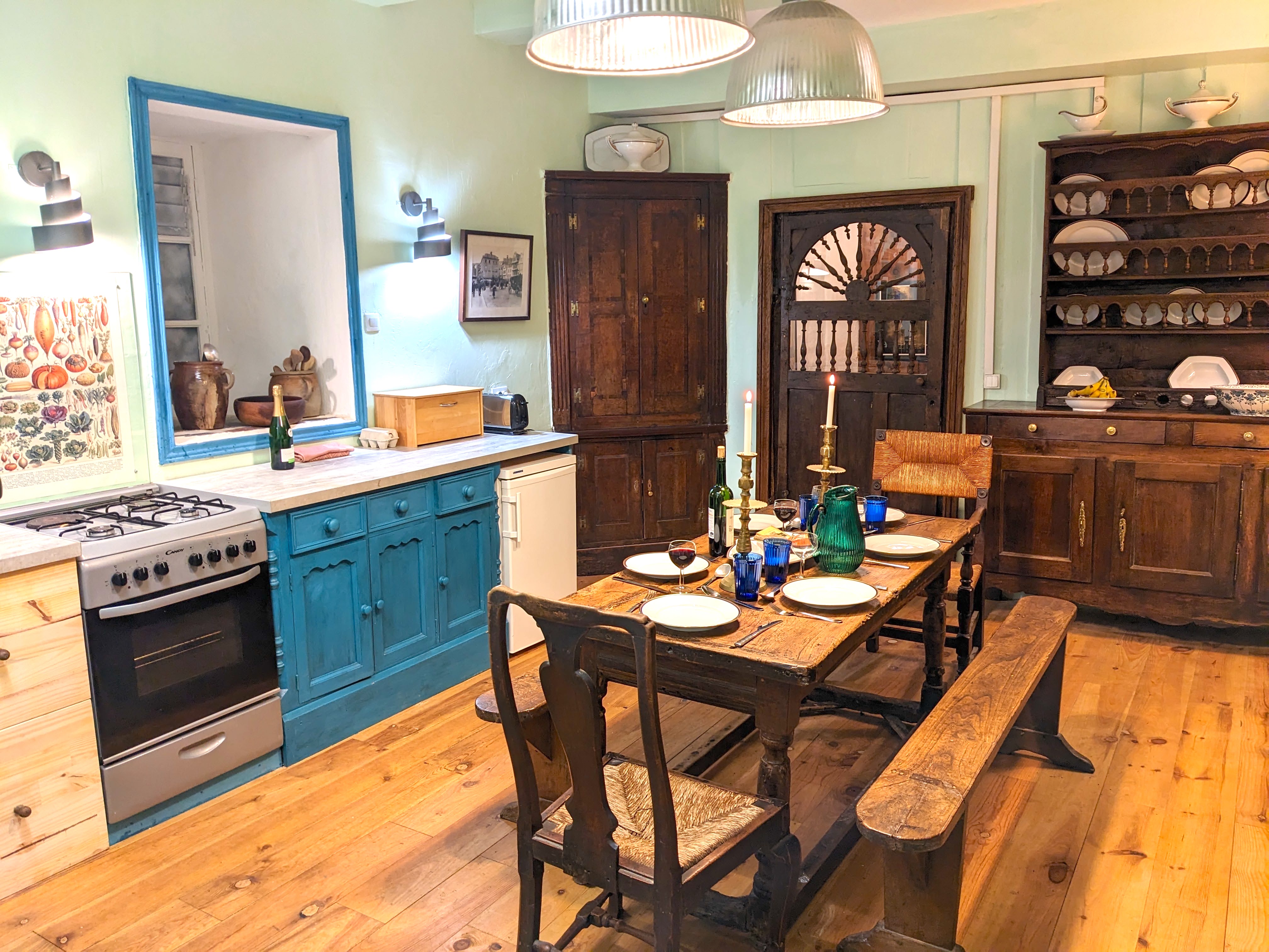 Kitchen: Double sink with draining board, cooker with gas and electric hobs, combi microwave, dishwasher, kettle. Dining table with 2 carver chairs and 2 benches, Large cast iron radiator with clothes drying rack above