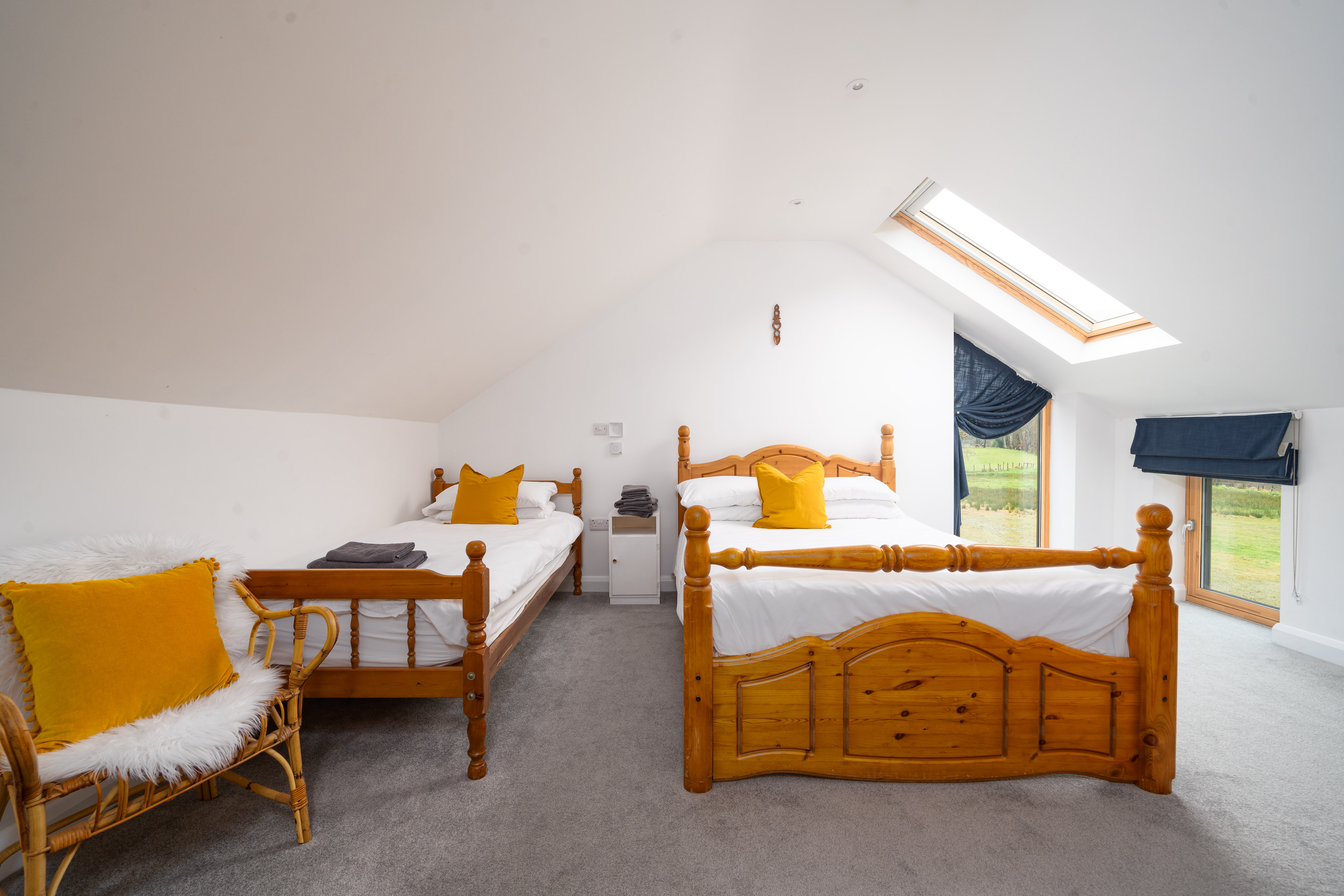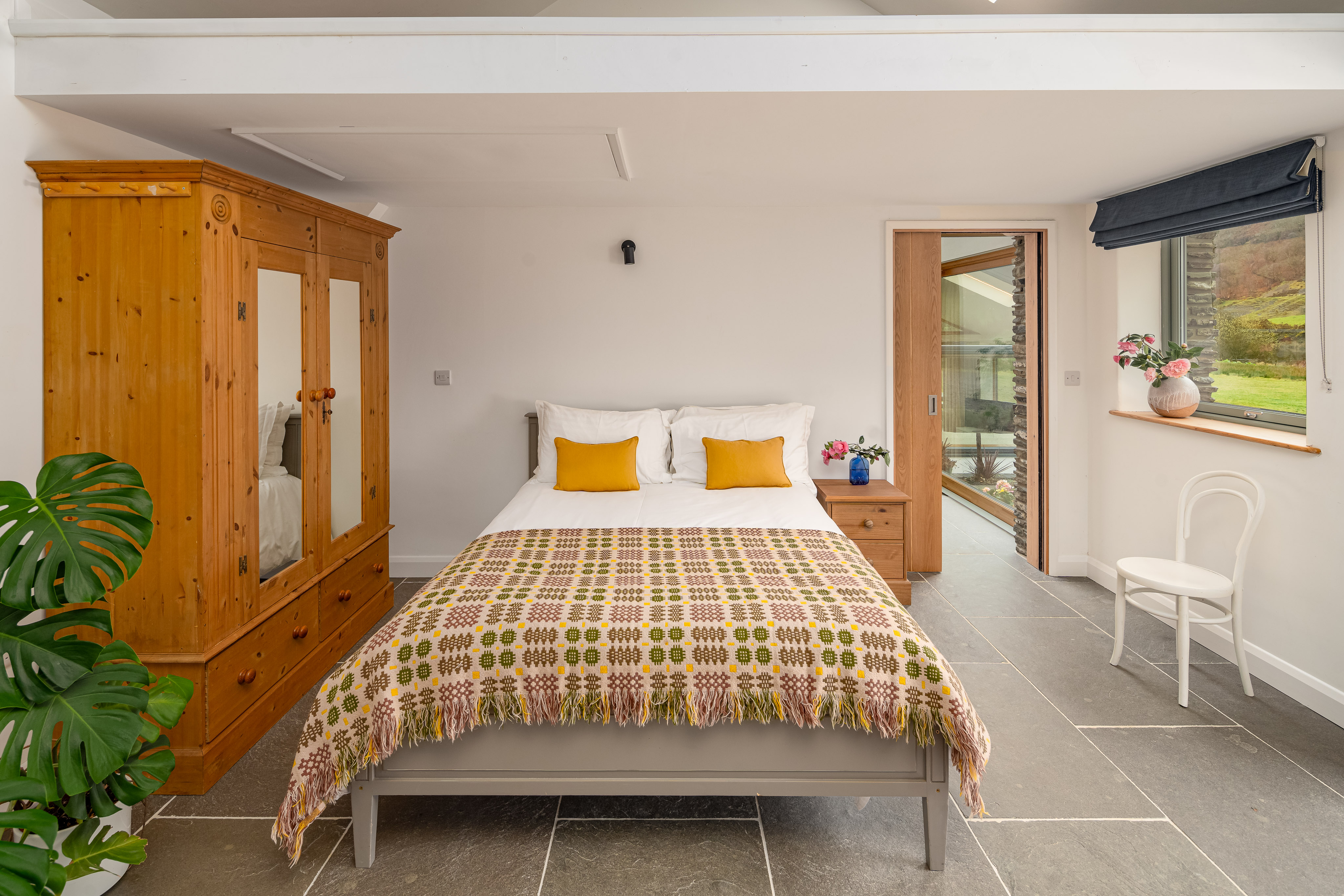 • Master Bedroom: woodburner, double bed, wardrobe, seating area with a coffee table, leather sofa and side chair.  Door leading outside