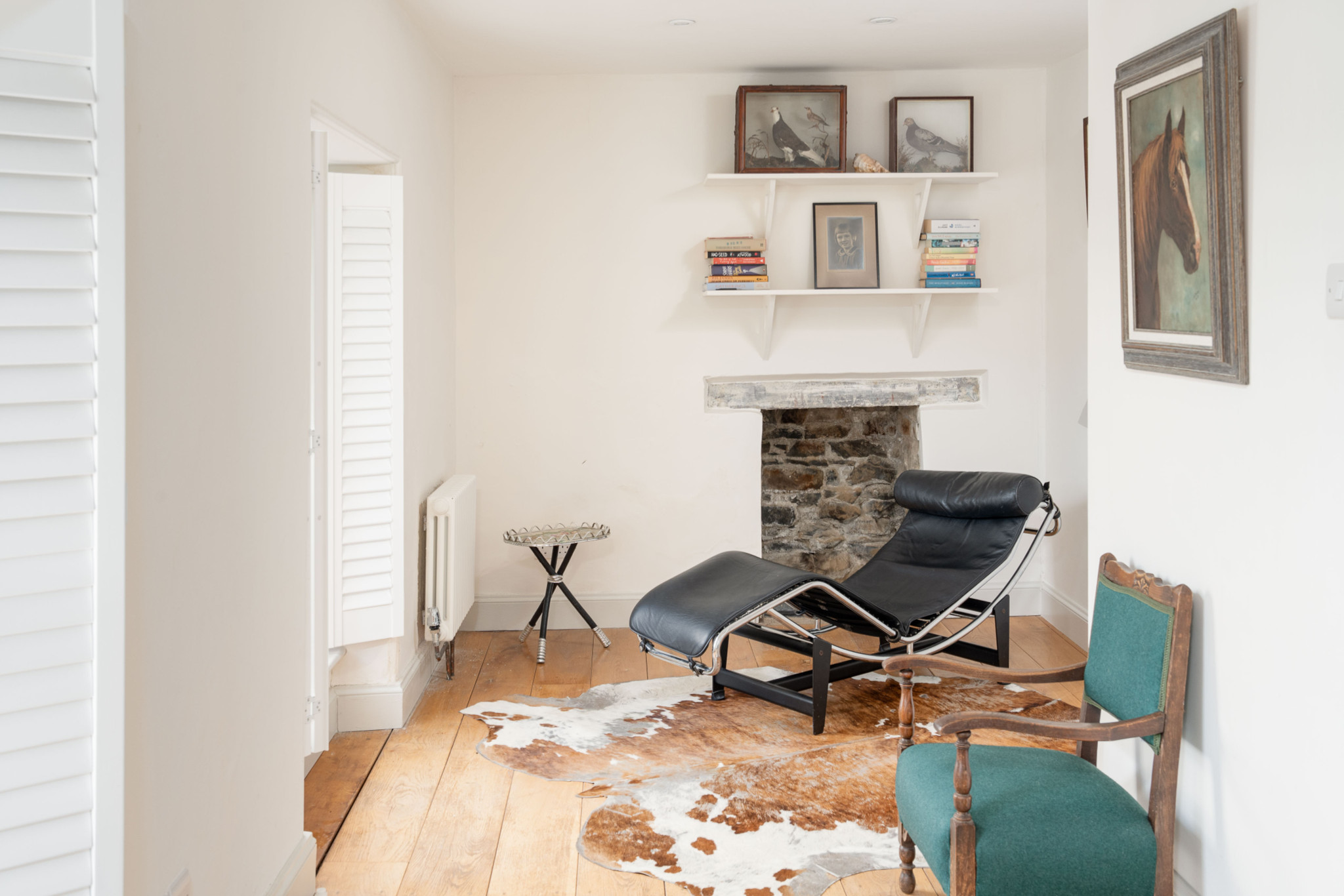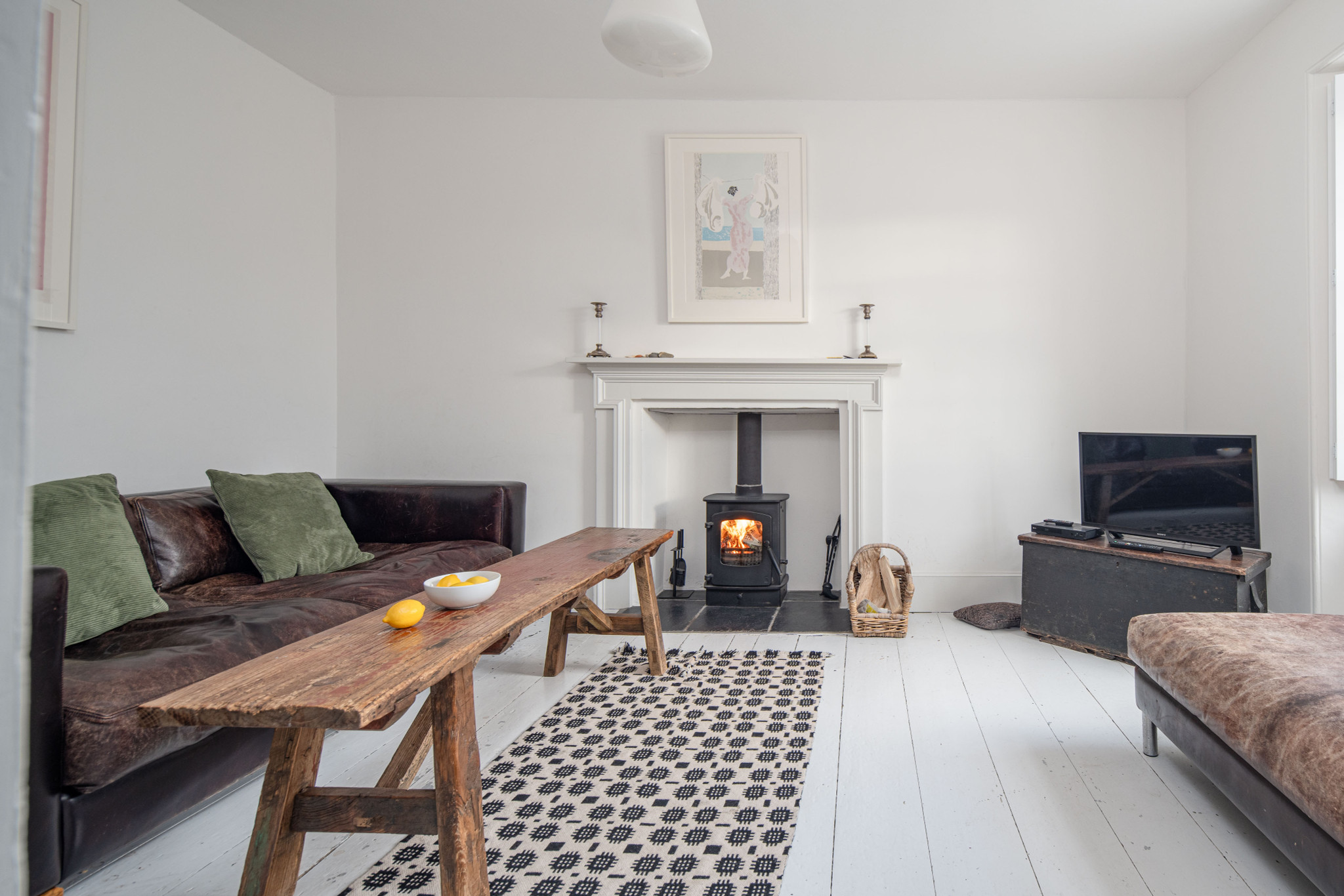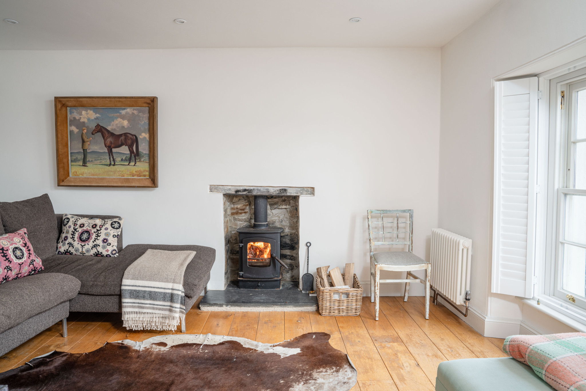 - Large living room with Charnwood stove, sofa, reading chair (and a vintage backgammon set!)