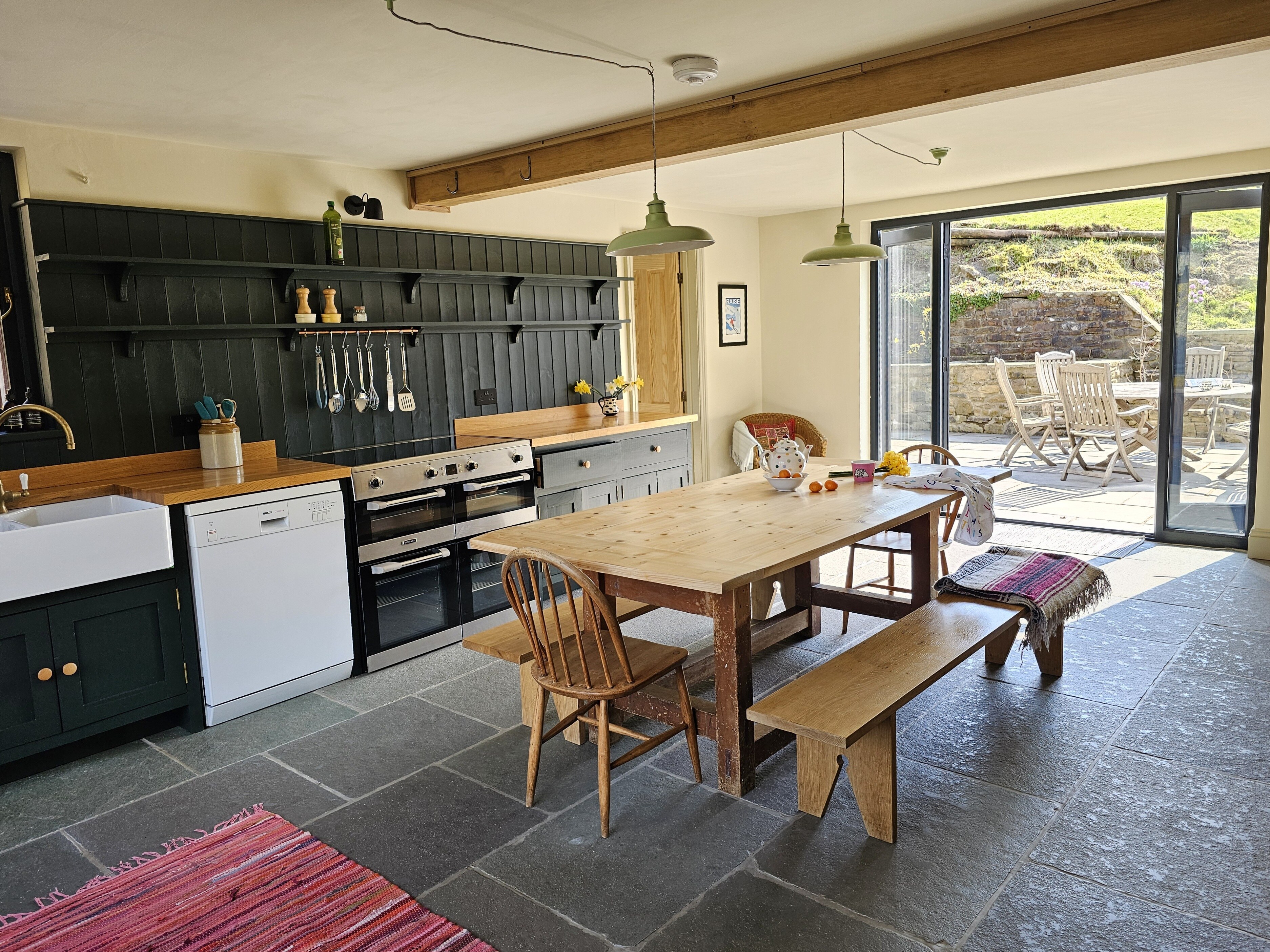 Kitchen/Dining Room: Underfloor heating, open-plan, with French doors to the patio, Induction range cooker, microwave, fridge-freezer, dishwasher