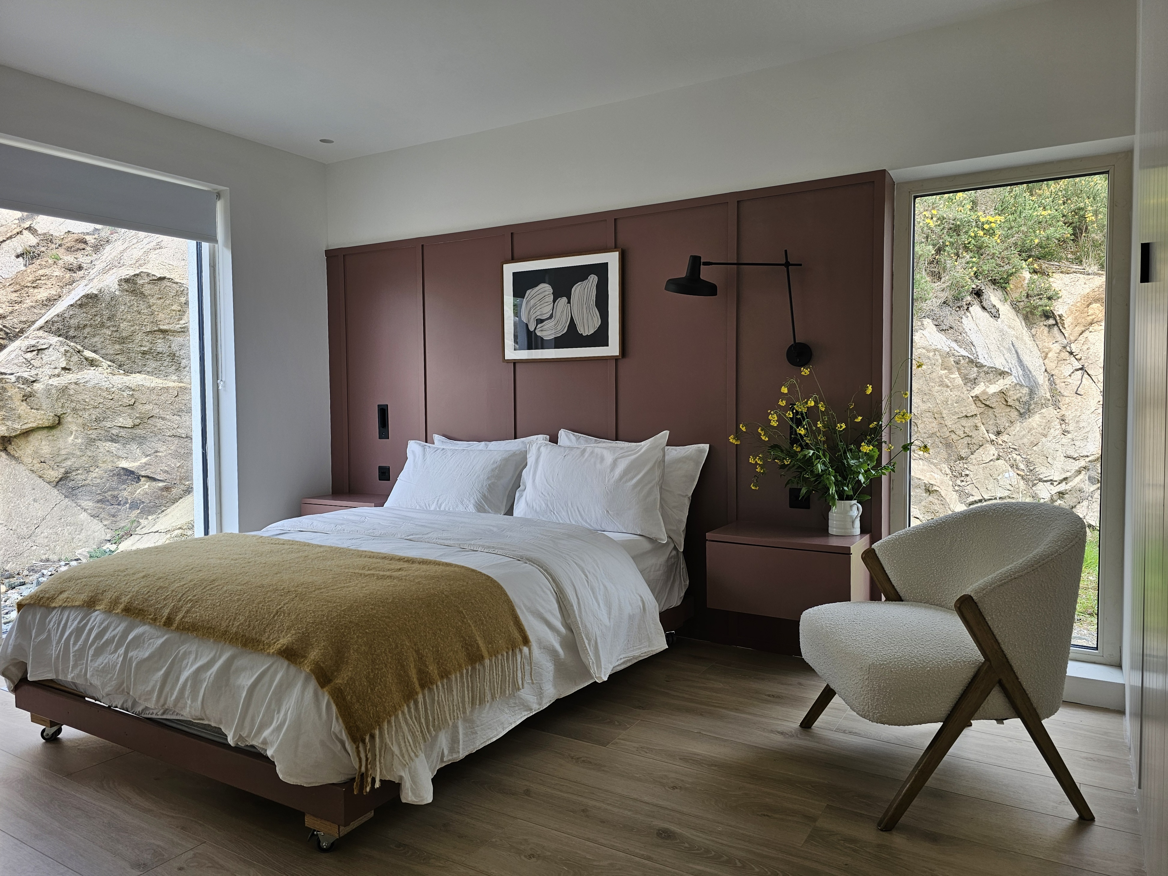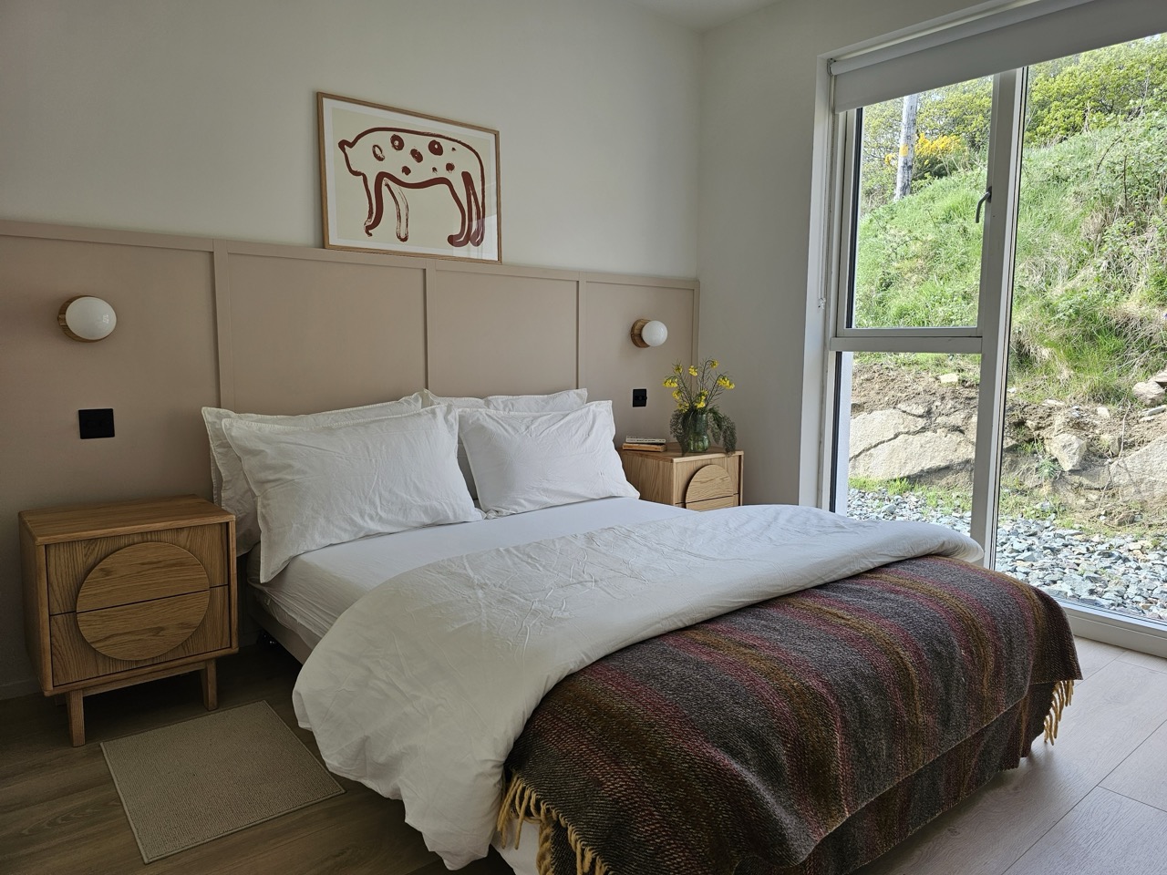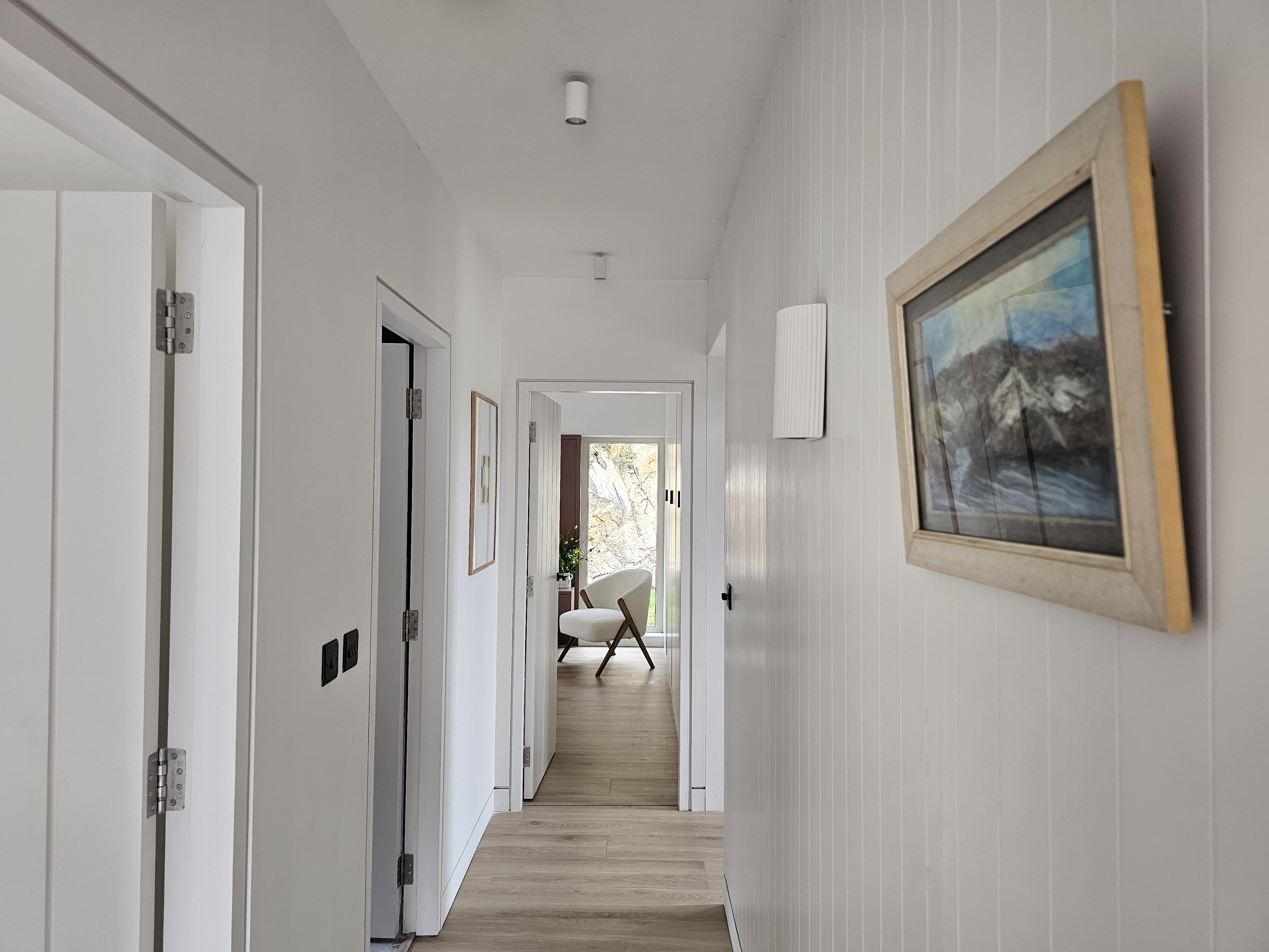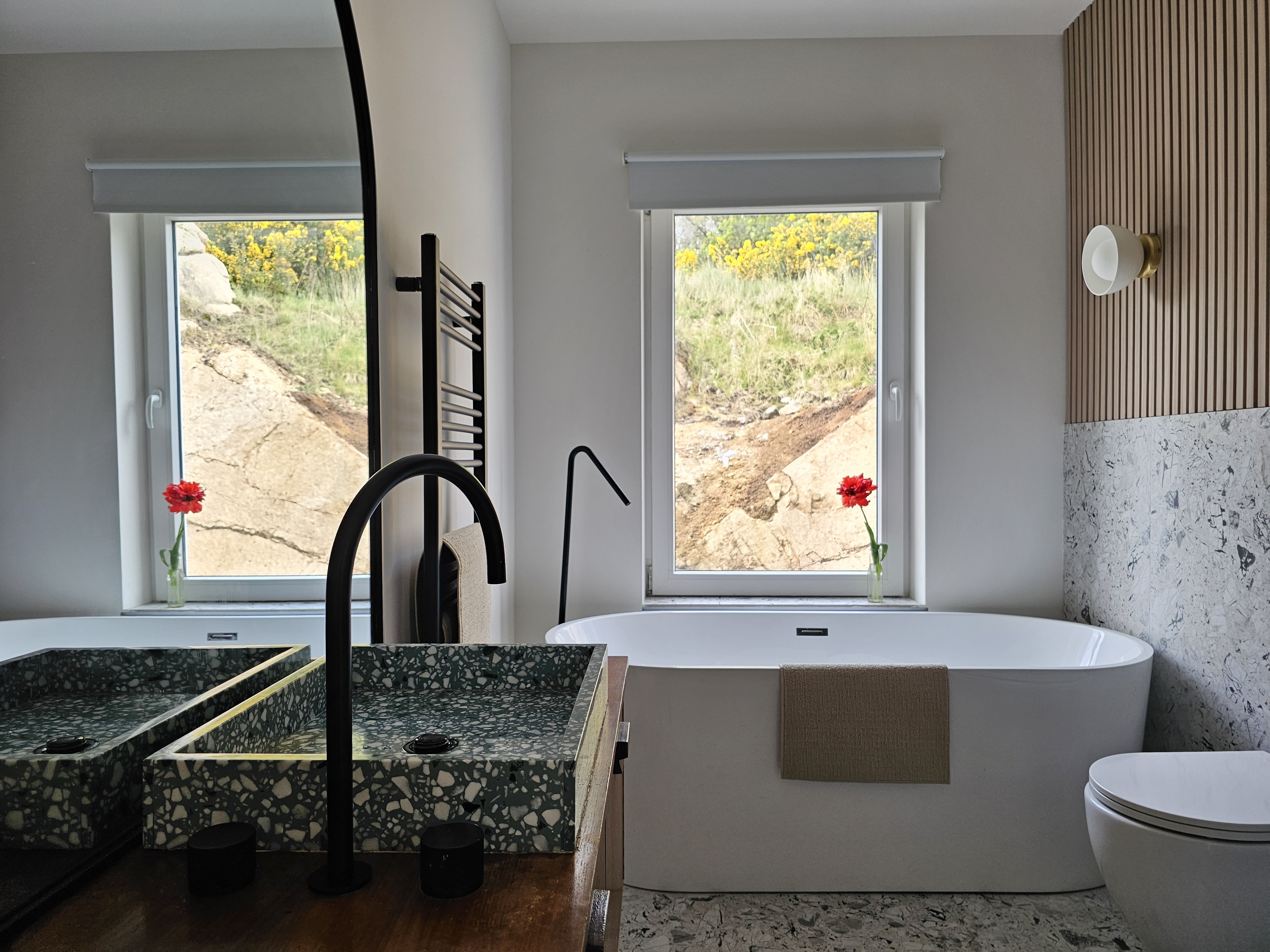 The house has a minimalist, almost Nordic feeling sparse interior with three well-sized bedrooms and two genuinely luxurious bathrooms.