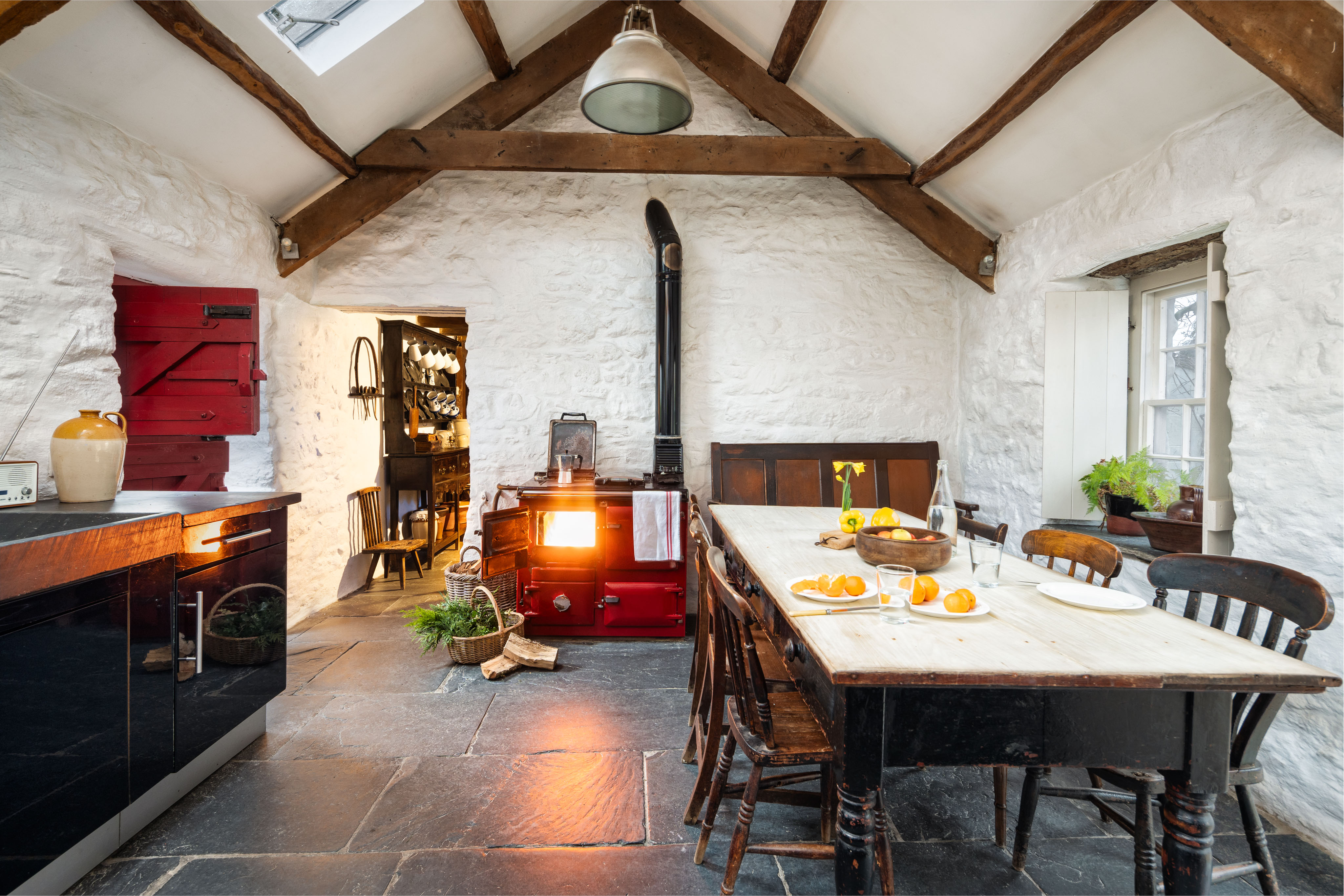 Cegin Fawr is the main room of the house (literally the 'Great Kitchen'). Working inglenook with genuine Victorian cast-iron range. Welsh stick chairs, settles and an Ercol sofa and chair.