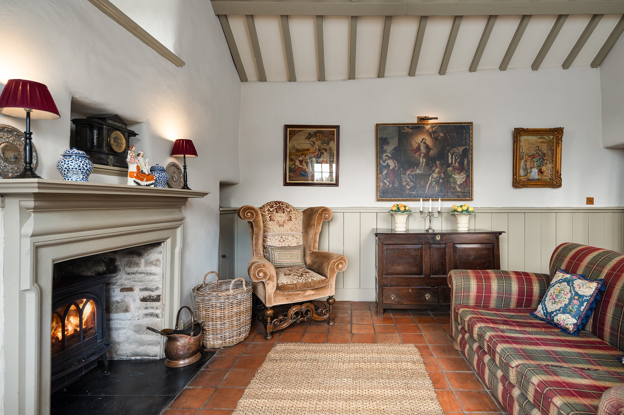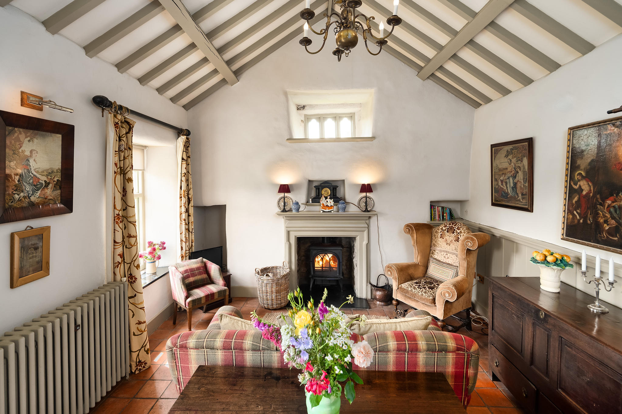 - Sitting Room - Fine views from three huge windows / French doors onto the patio and gardens. Wing-back armchairs, a woodburning stove and dining with more views. Unobtrusive flatscreen TV/ DVD with basic satellite channels.