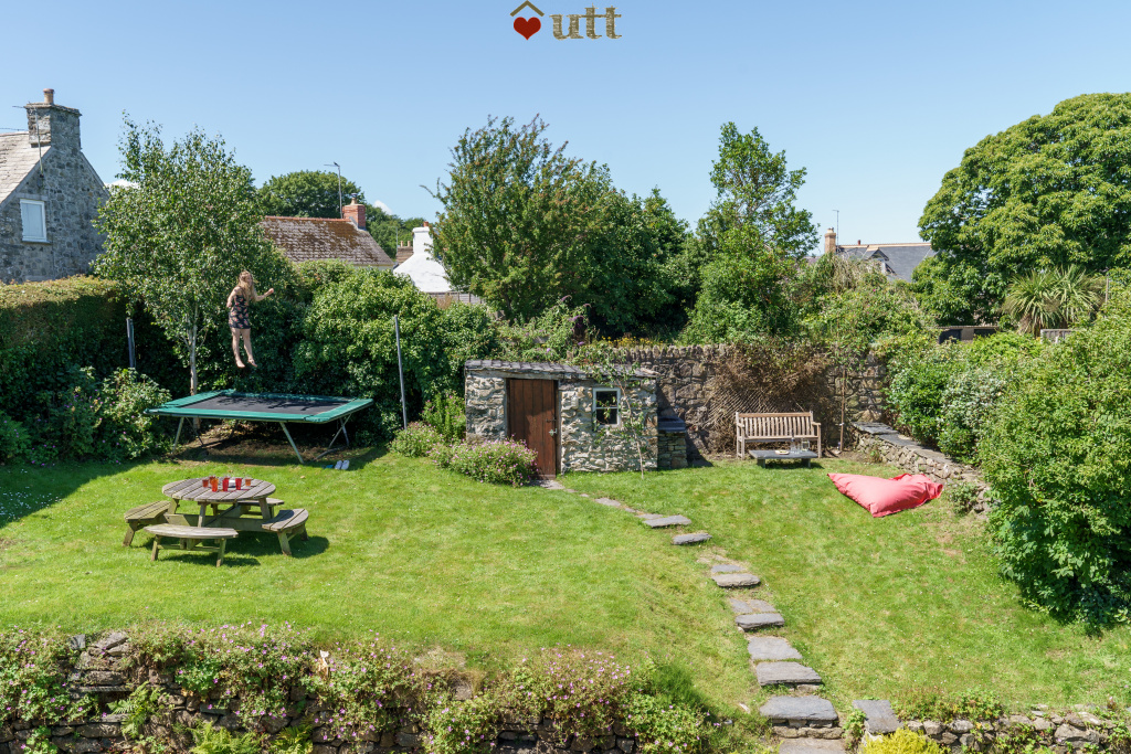 - Slate slab steps lead to a large lawned garden which is bathed in sunshine for most of the day, with distant views of the sea in front and the castle and Carn Ingli behind. Garden bench.