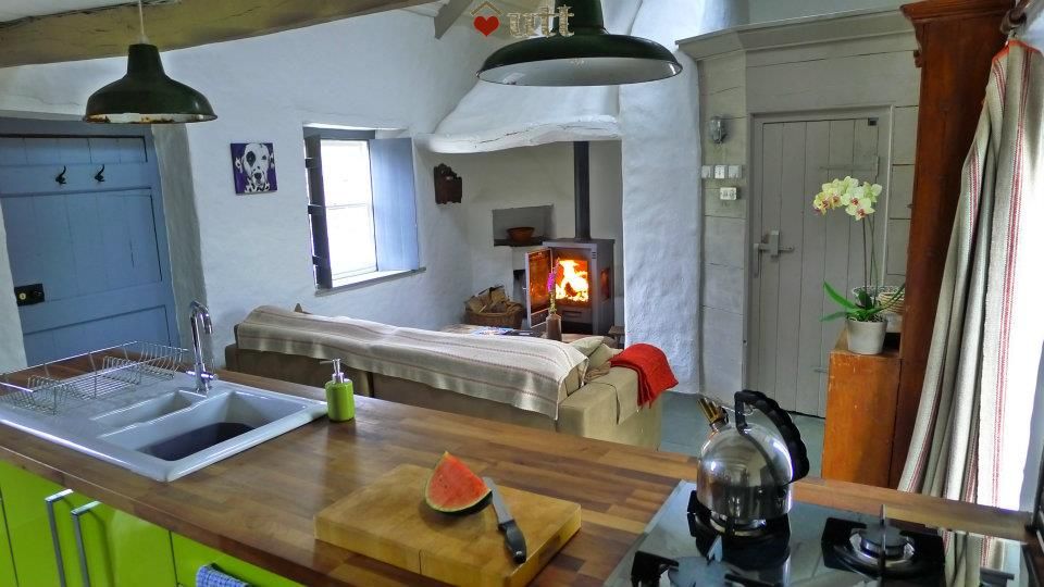 - Cegin Fawr with c4m high ceiling giving sense of space. Slate floors, woodburner, sofa, table & chairs. Doors front and back.