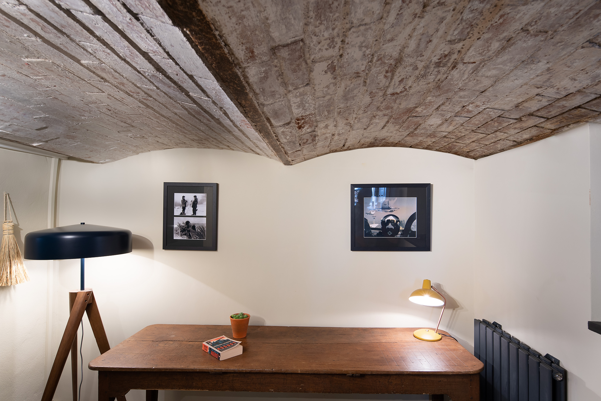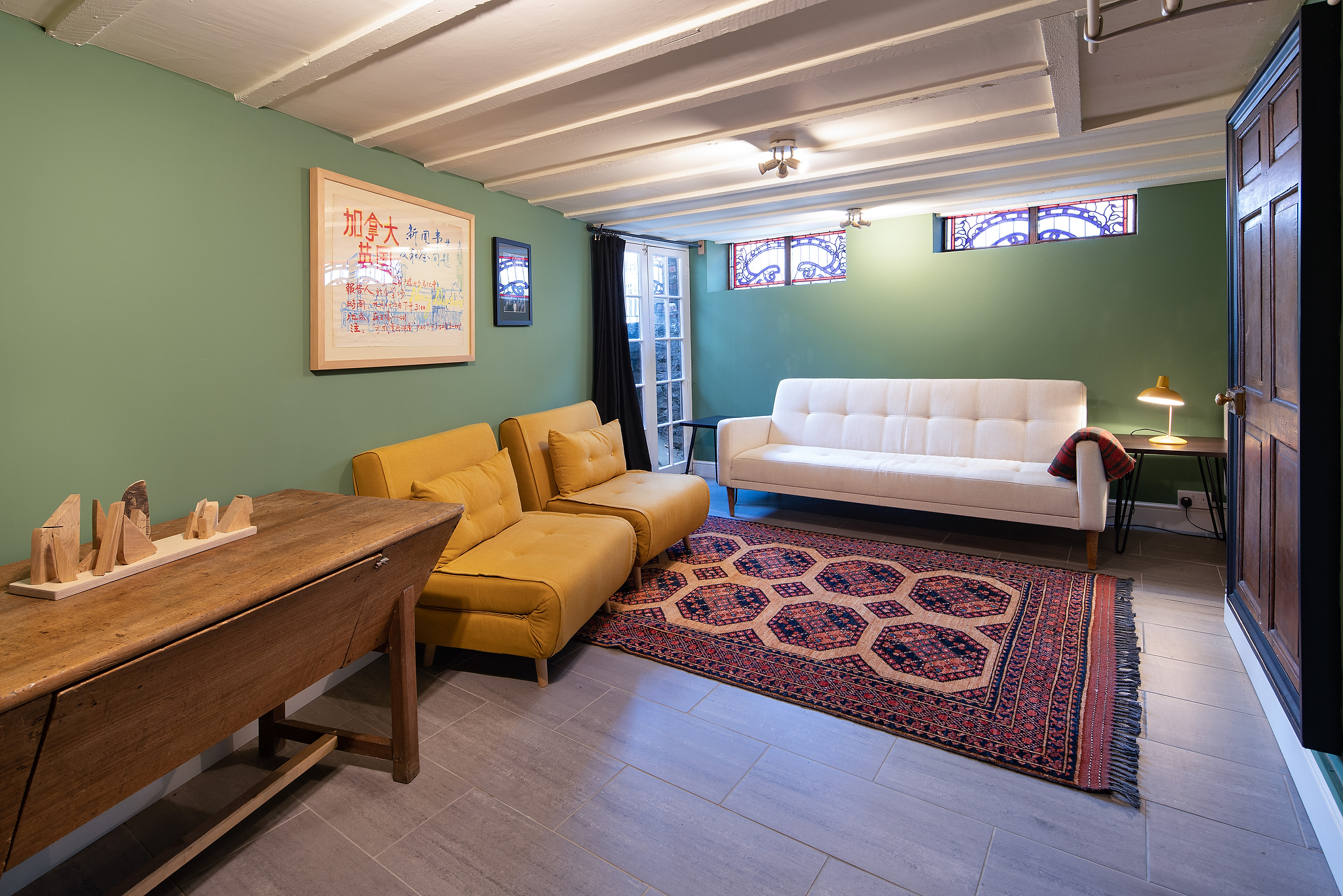 Lower ground floor: small study under a vaulted brick ceiling. Beside it is another sitting room with two single sofa beds.