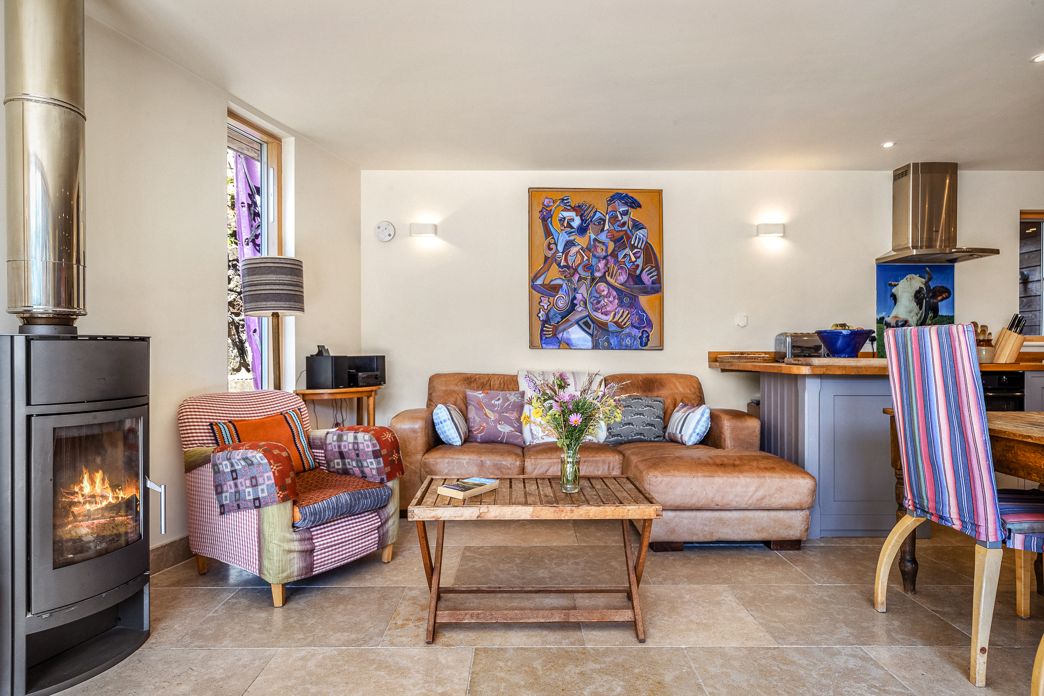 Living area: With wood burner and DAB radio / CD player. Large leather corner sofa, wood burning stove. Antique leather armchair. Floor-to-ceiling glass doors overlook a large decked area and harbour.