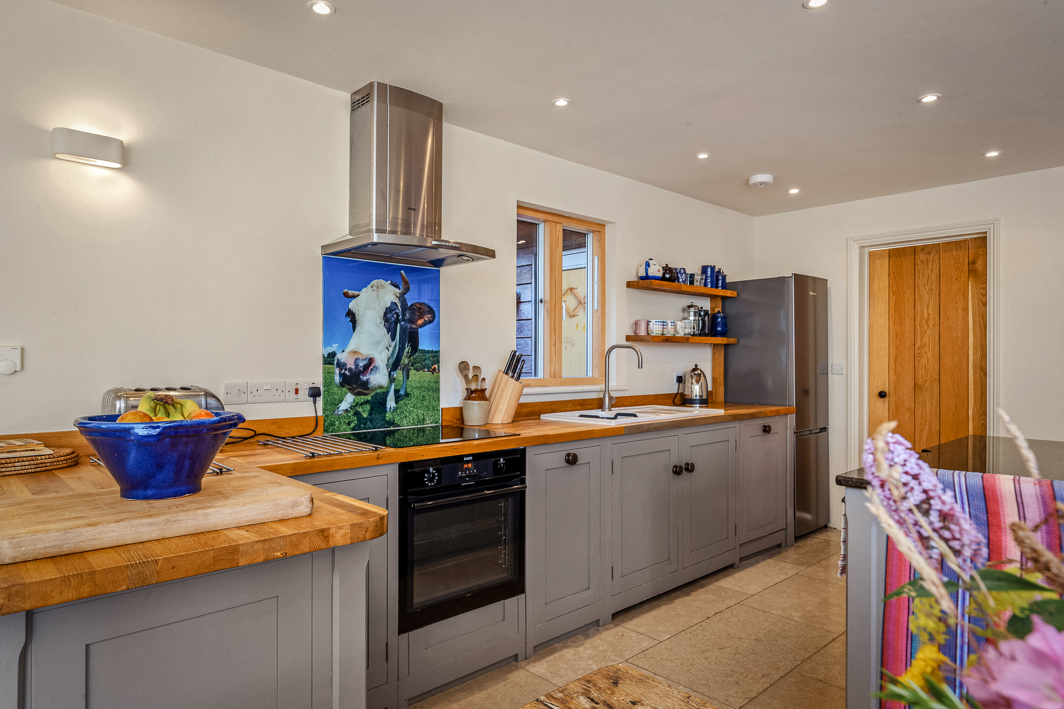 Kitchen area: electric oven induction hob, microwave, fridge/freezer and dishwasher.