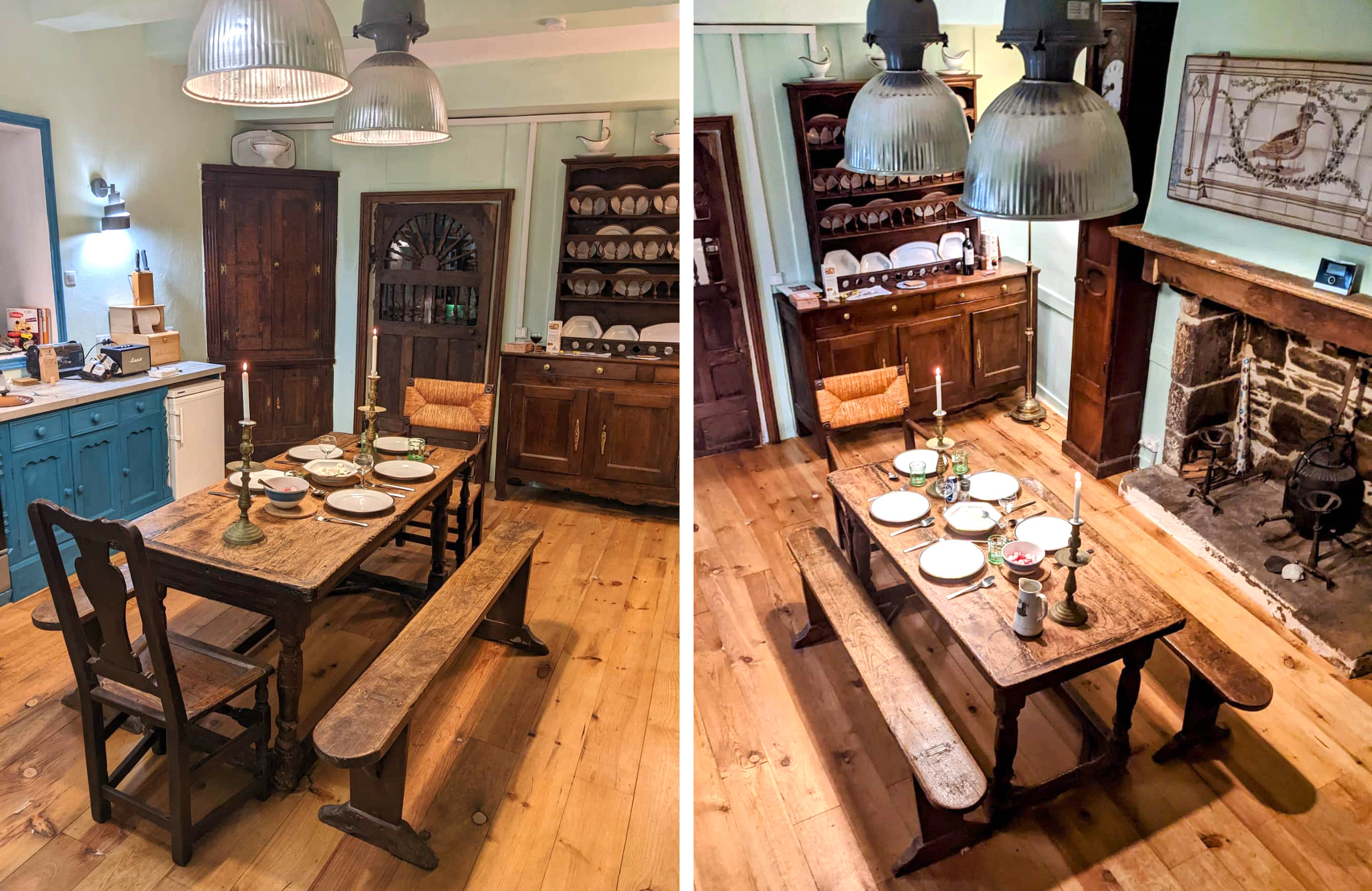 Kitchen: Double sink with draining board, cooker with gas and electric hobs, combi microwave, dishwasher, kettle. Dining table with 2 carver chairs and 2 benches, Large cast iron radiator with clothes drying rack above