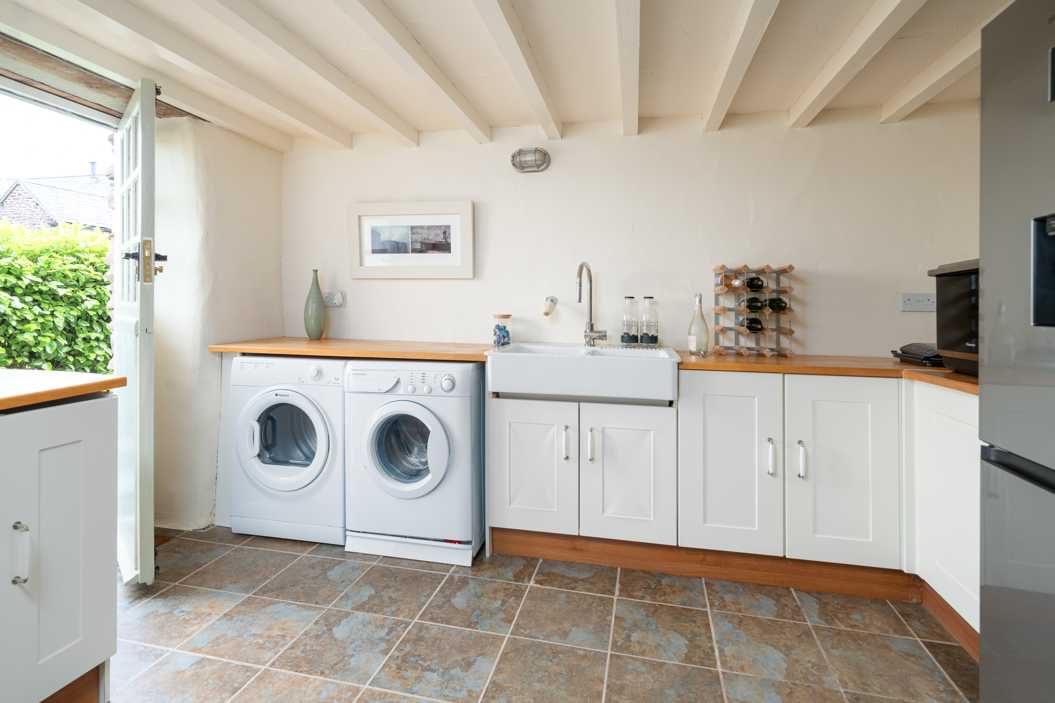 - Utility room: sink, washing machine, tumble dryer, clothes drying rack, fridge-freezer, microwave.