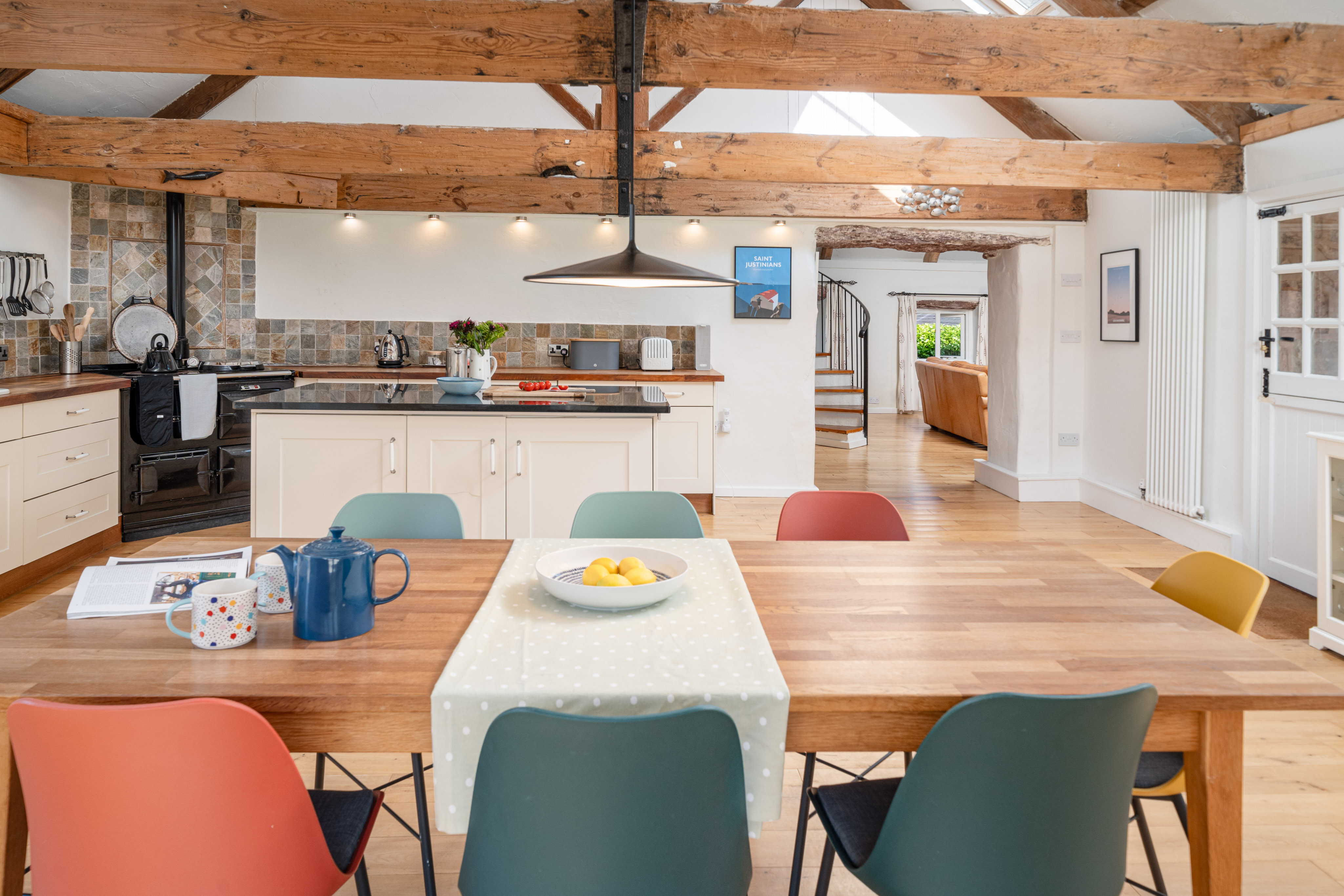 - Open plan kitchen/ dining room: dining table, dishwasher, fridge, Sonos smart speaker