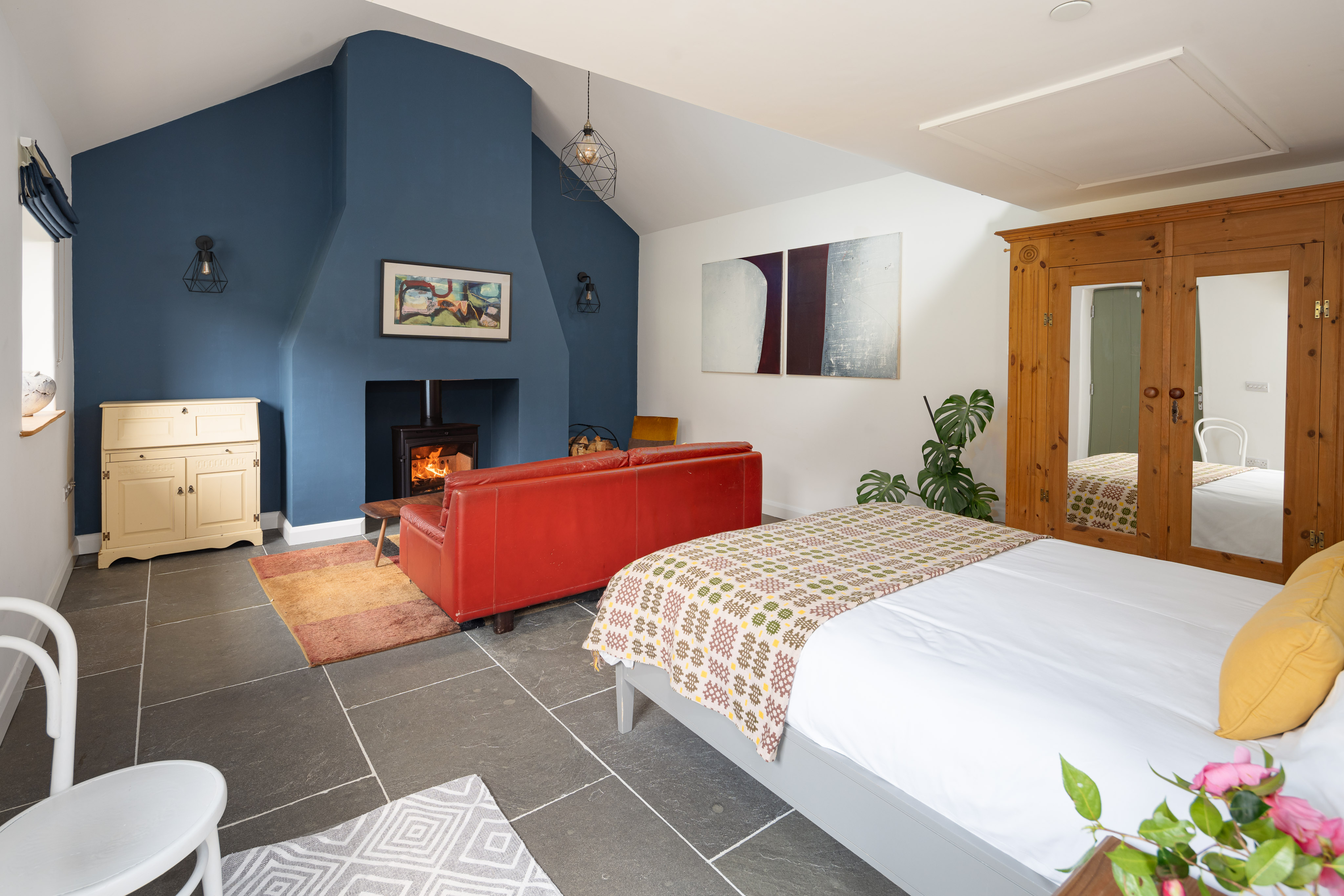 - Master Bedroom: woodburner, double bed, wardrobe, seating area with a coffee table, leather sofa and side chair. Door leading outside