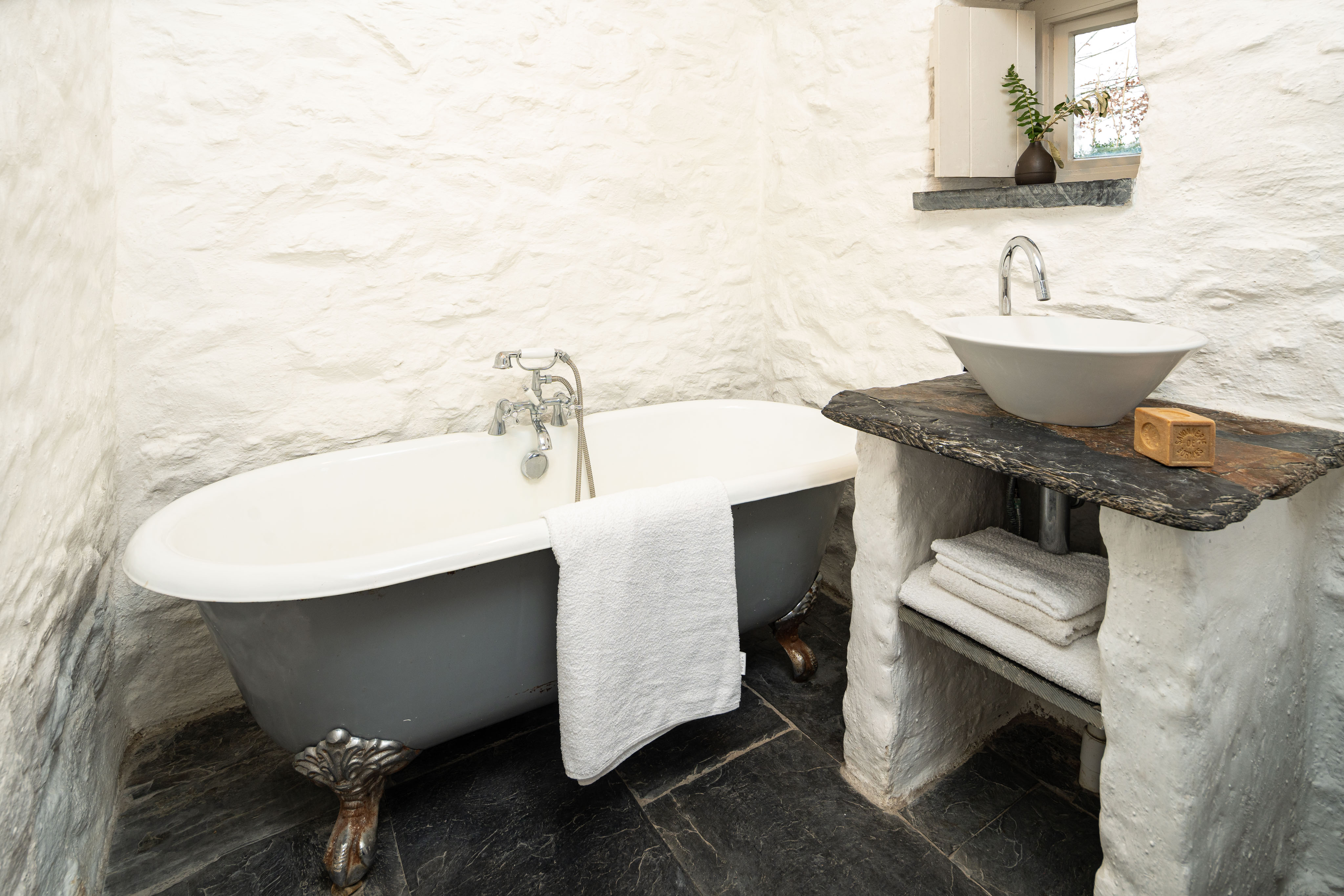 Bathroom (ground floor) in former dairy with contemporary roll-top bath and modern designer fittings, heated towel rail.