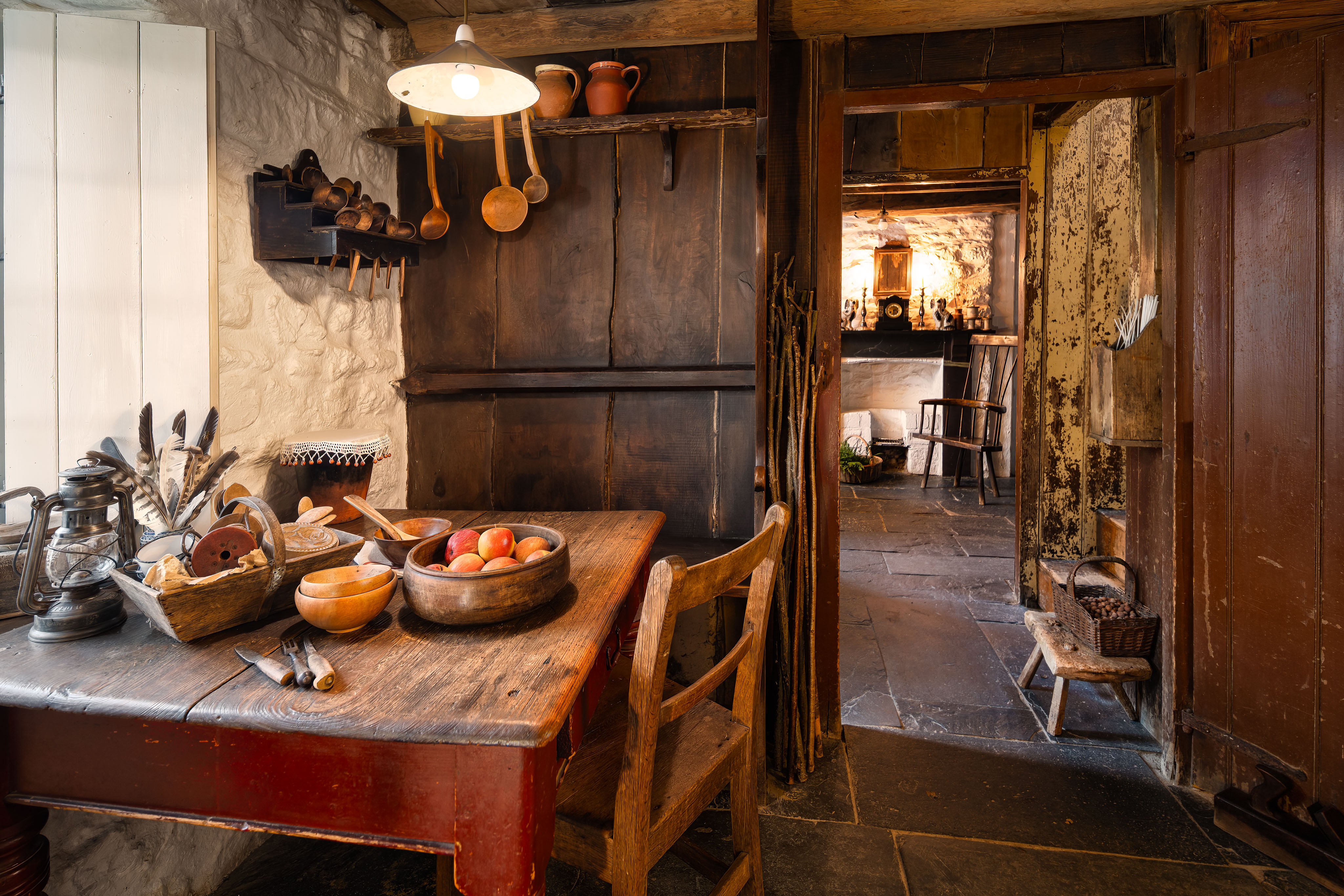 Cegin Fawr is the main room of the house (literally the 'Great Kitchen'). Working inglenook with genuine Victorian cast-iron range. Welsh stick chairs, settles and an Ercol sofa and chair.
