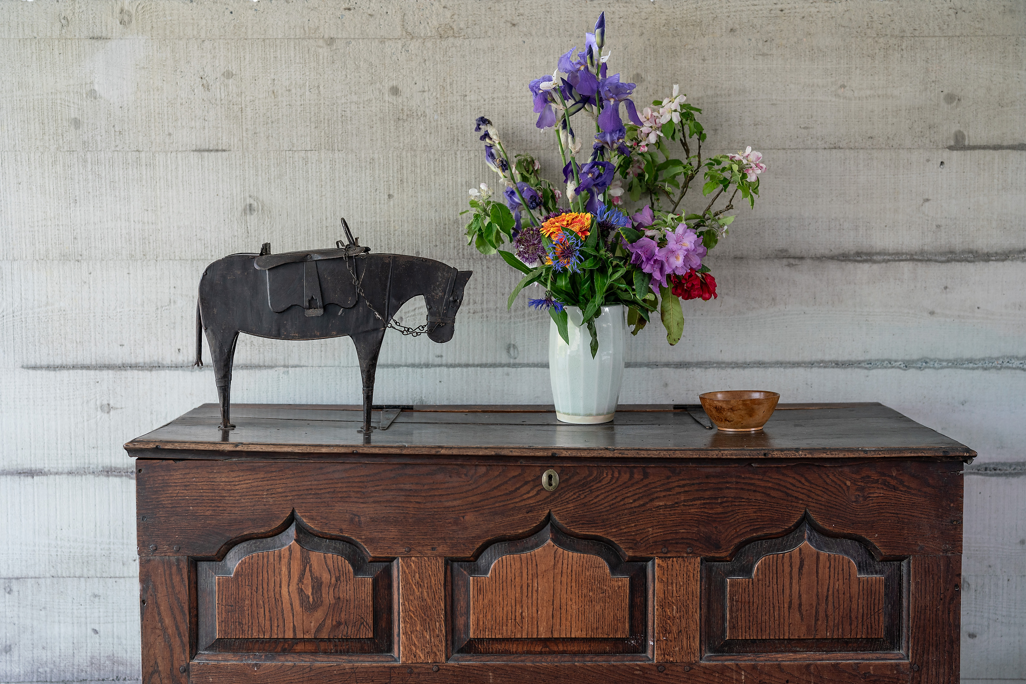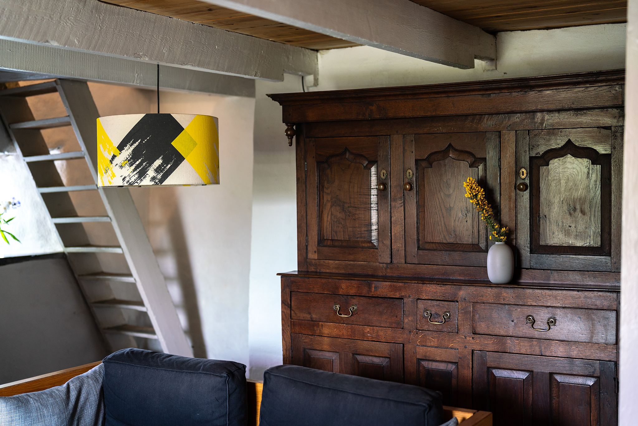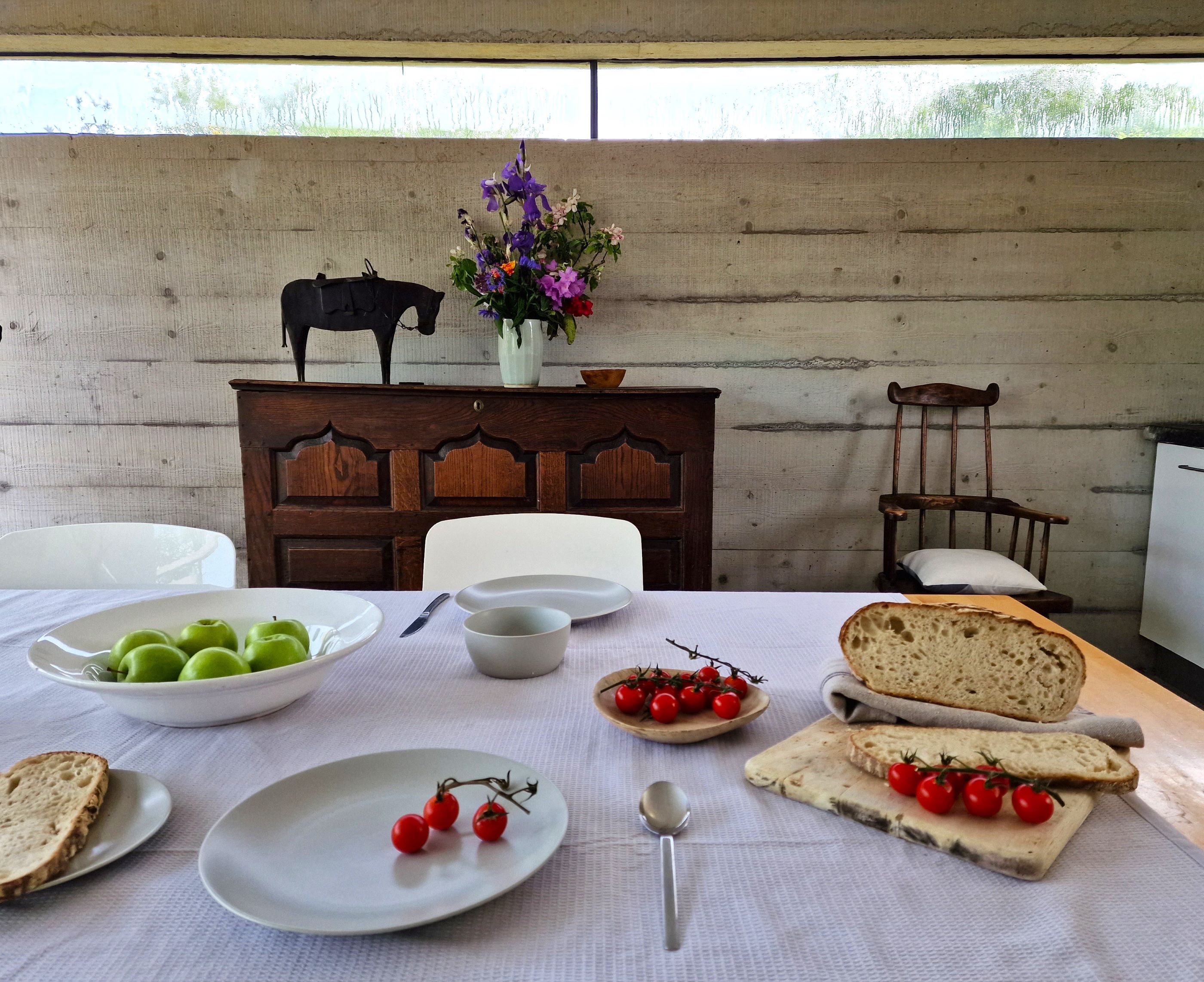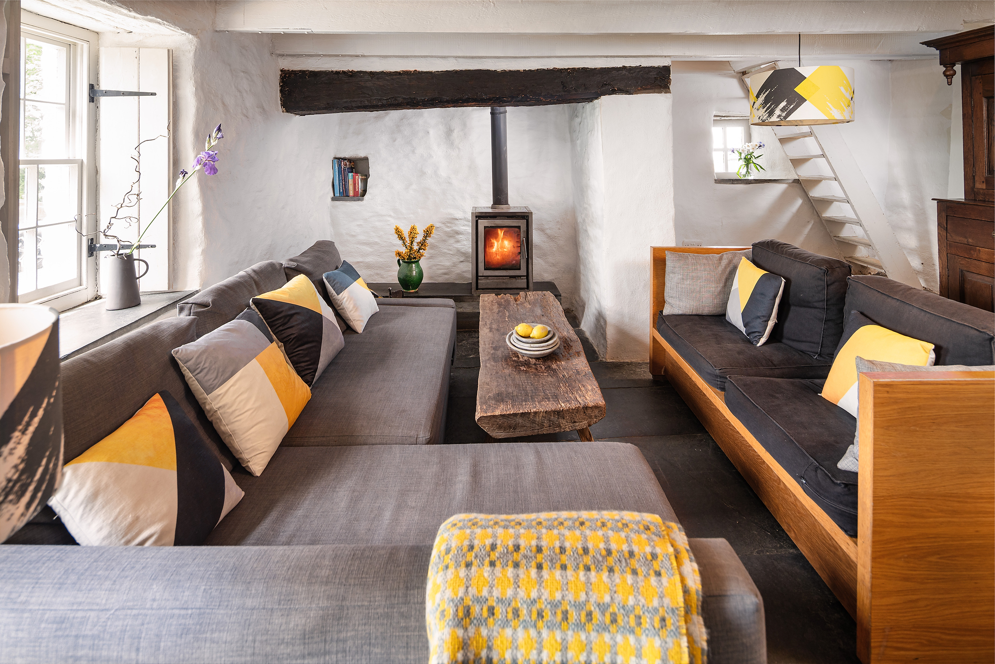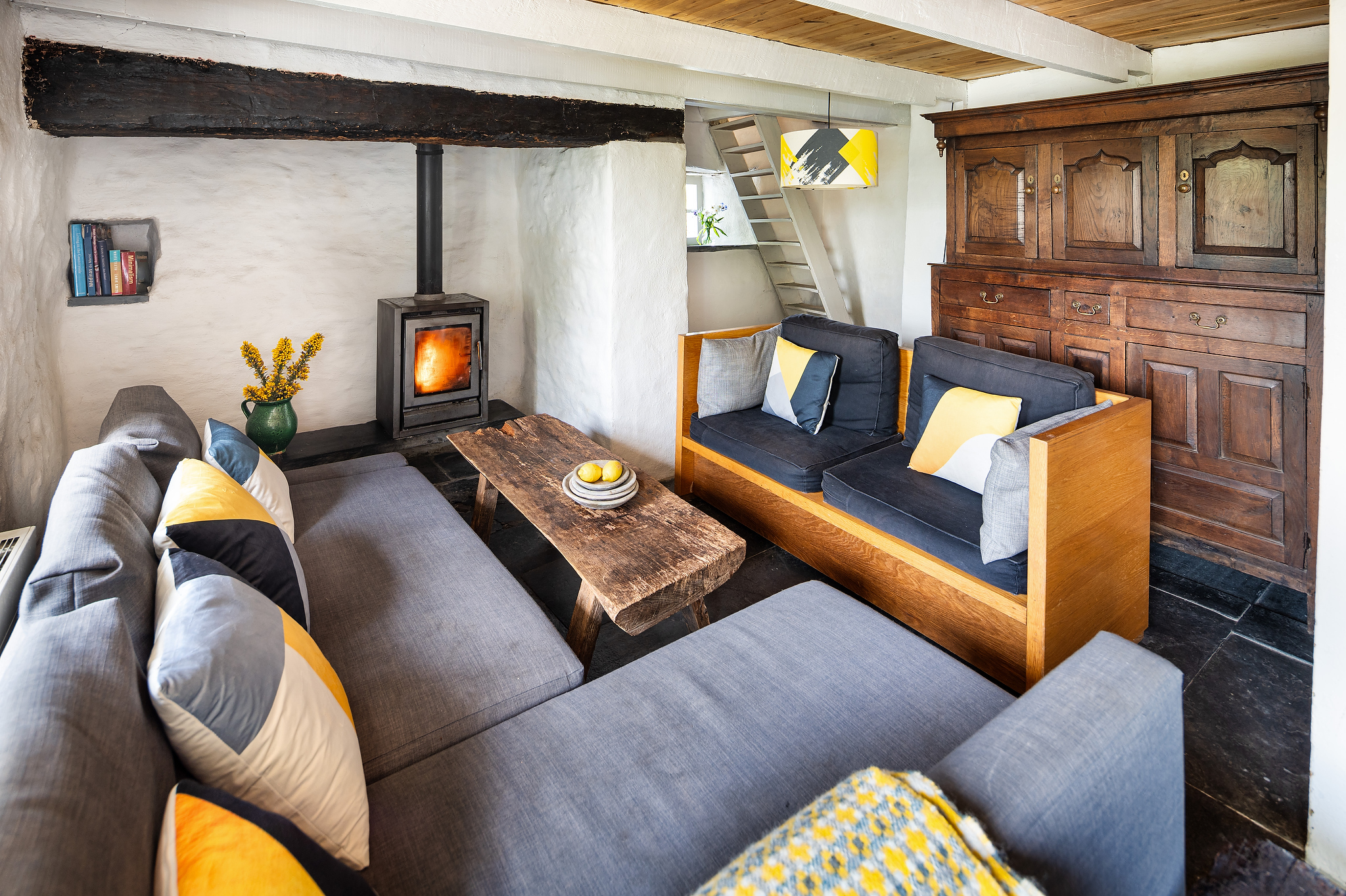 - Cegin Fawr - (up two stairs). Open plan with woodburning stove, modernist sofa (no TV), double day-bed that can be made up as groundfloor bed (standard double) on request.
