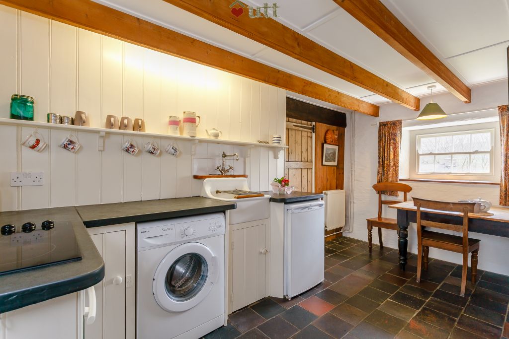 Cegin Fach: Belfast (half size) sink, electric cooker, washing machine, fridge with small freezer/icebox and microwave. Dining table.