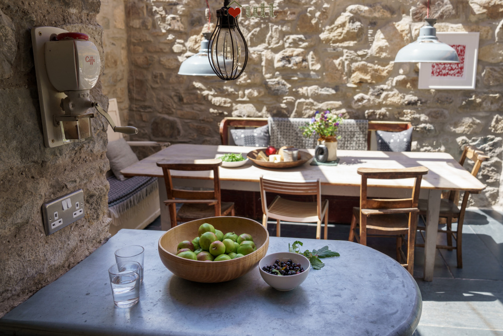 - From the dining area, a sunny patio, enclosed by dry stone walling,