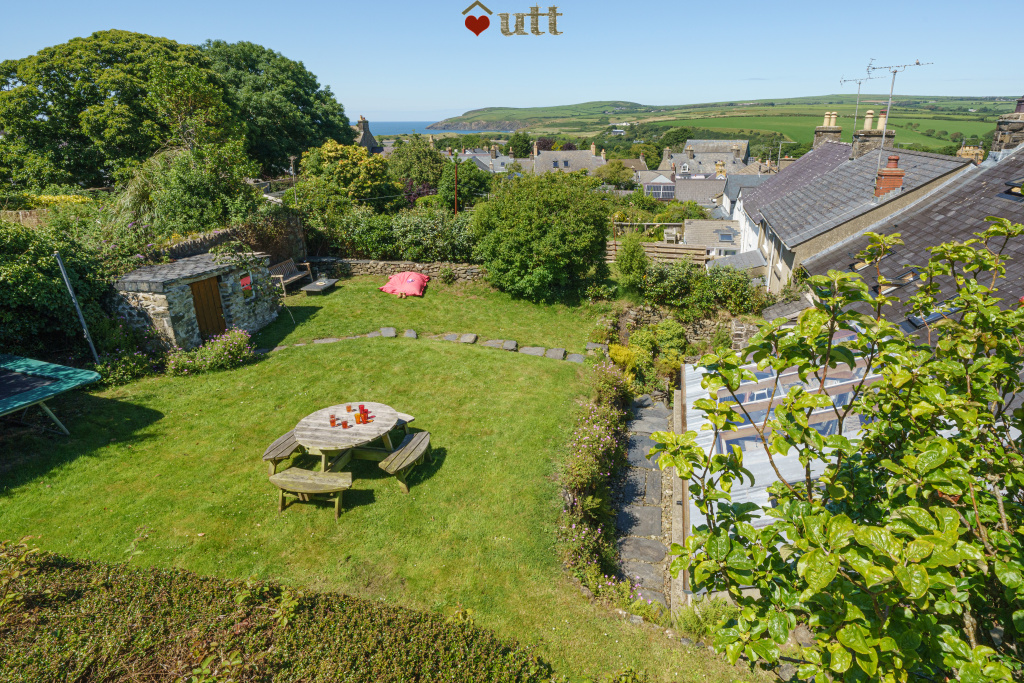 - Slate slab steps lead to a large lawned garden which is bathed in sunshine for most of the day, with distant views of the sea in front and the castle and Carn Ingli behind. Garden bench.