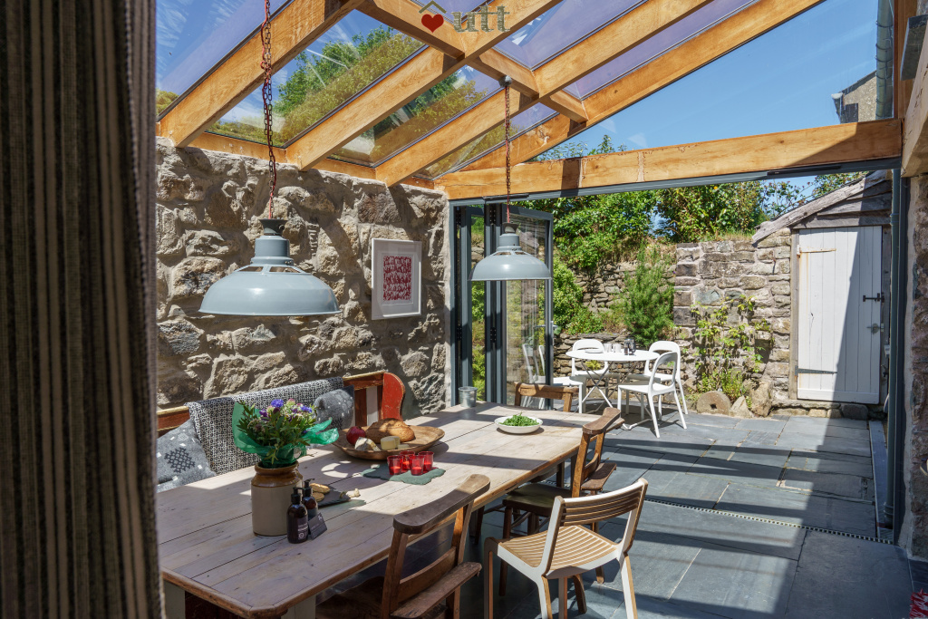 - The Dining area is a new extension (an architectural masterpiece!) with glass and oak roof and full-length glazed bi-fold doors leading directly onto the patio and garden beyond. This is a sun-drenched indoor/outdoor space made for family get-togethers and social occasions!