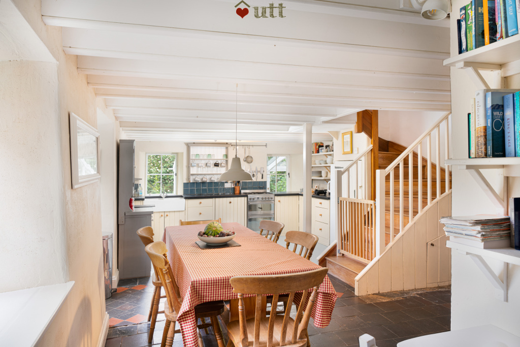 - Dining area: Traditional pine farmhouse table and chairs, dresser
